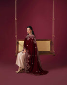 Showcase your fashion sense with this embroidered shawl from the latest Zar Winter Collection, blending delicate embroidery with graceful appeal.