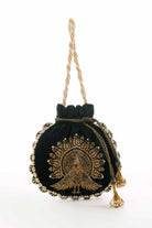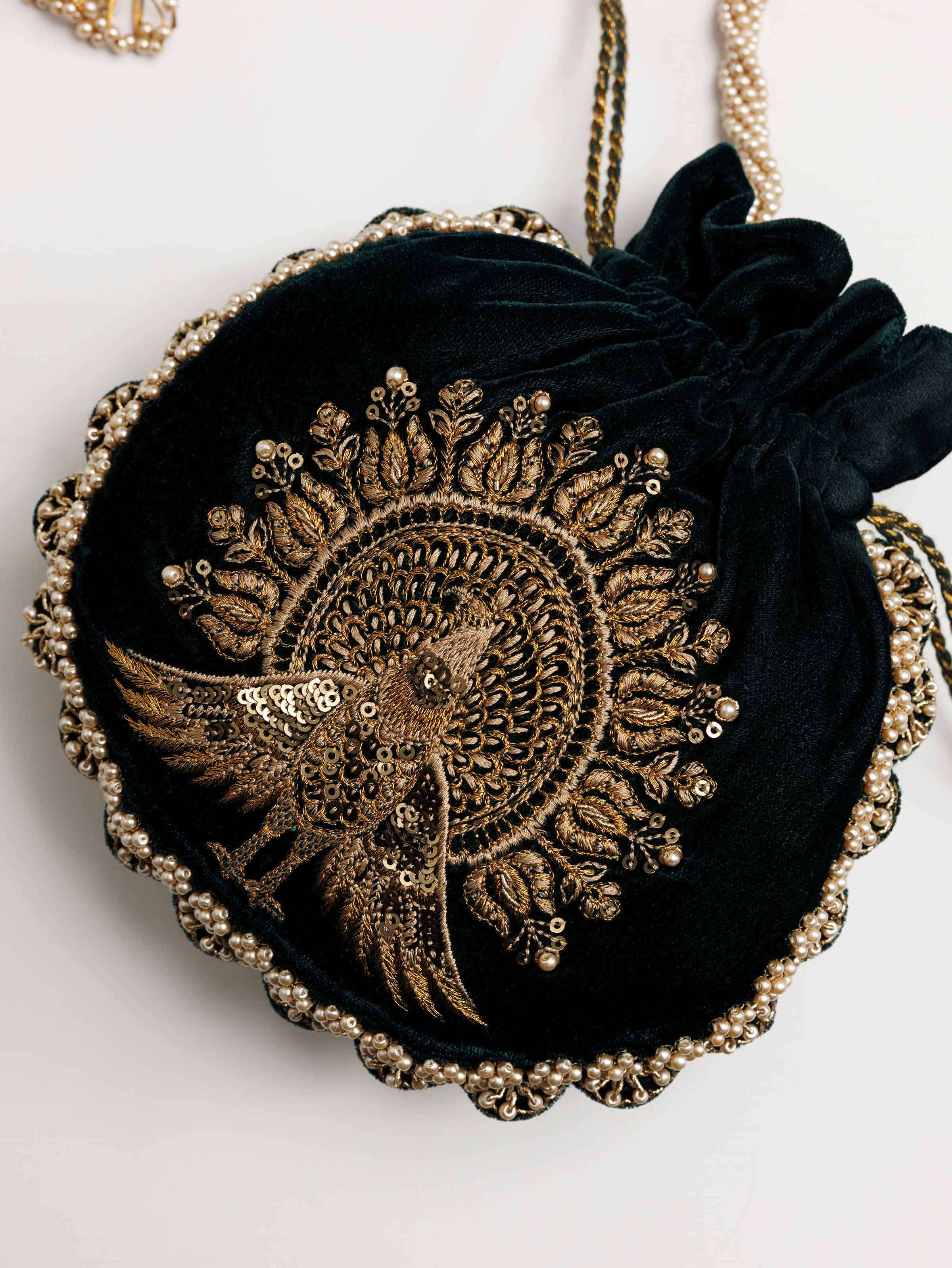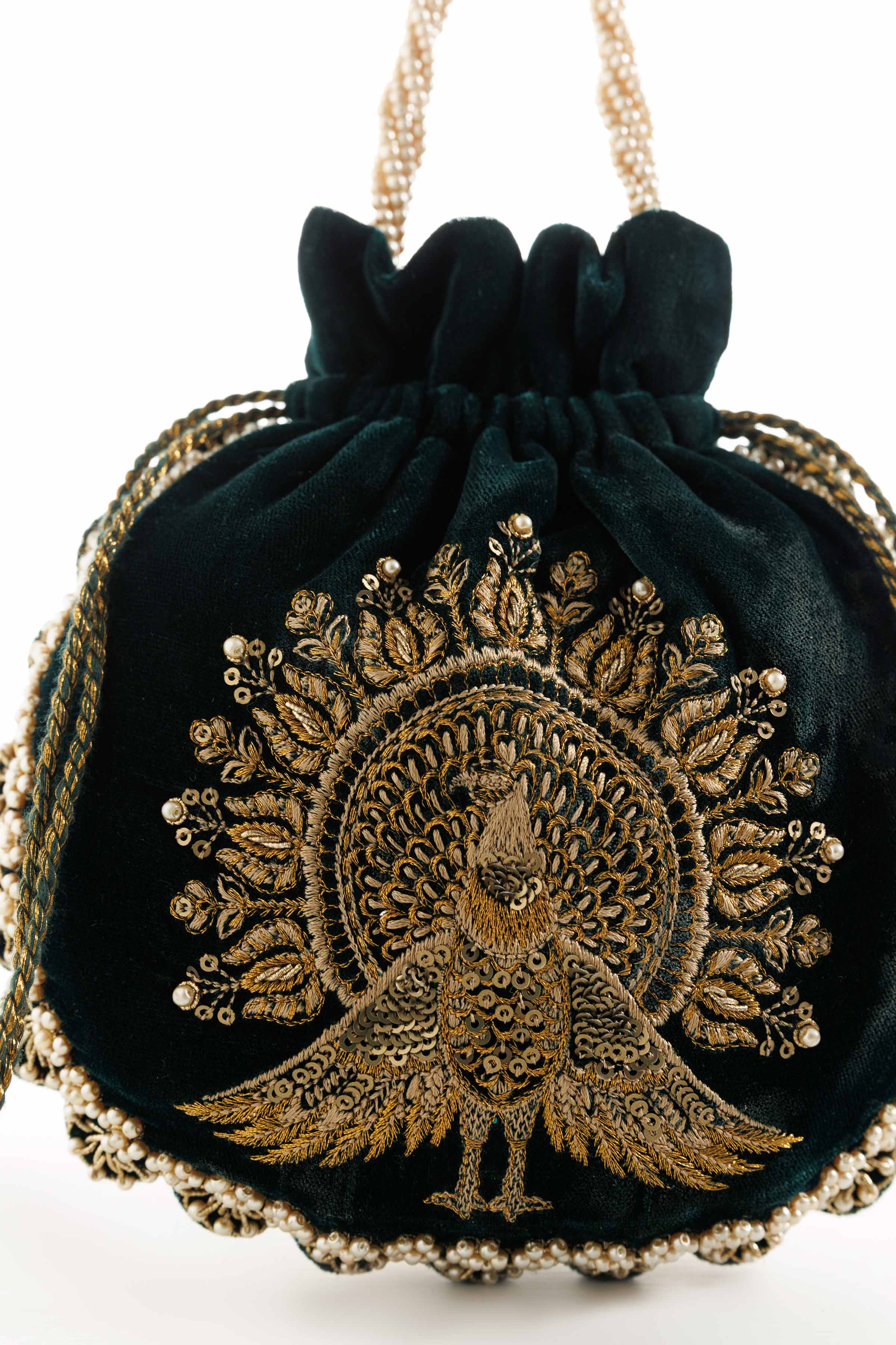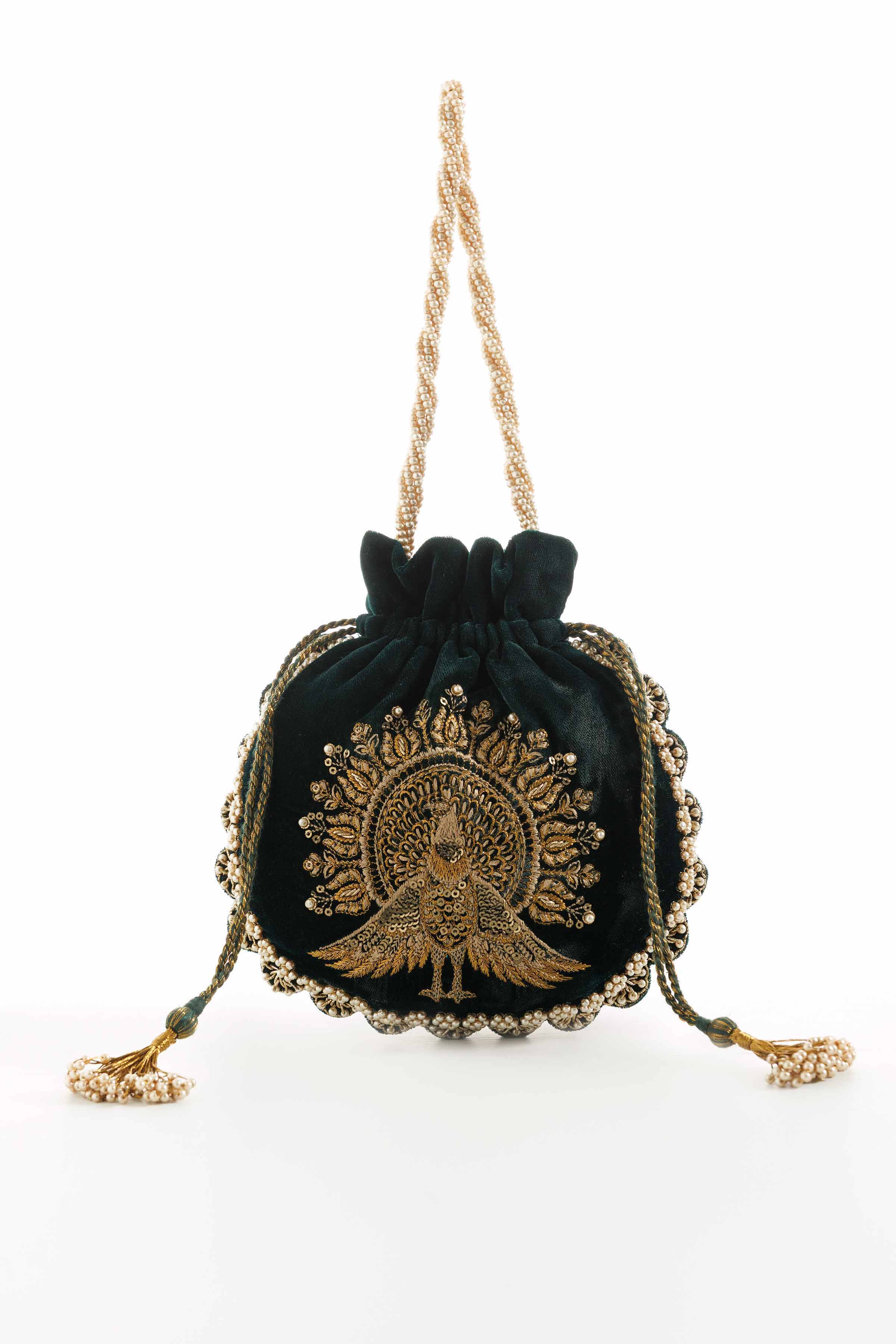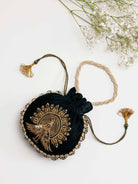 Embellished embroidered pouch enhanced with adda work and tassel details.