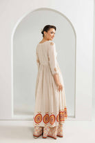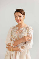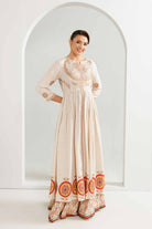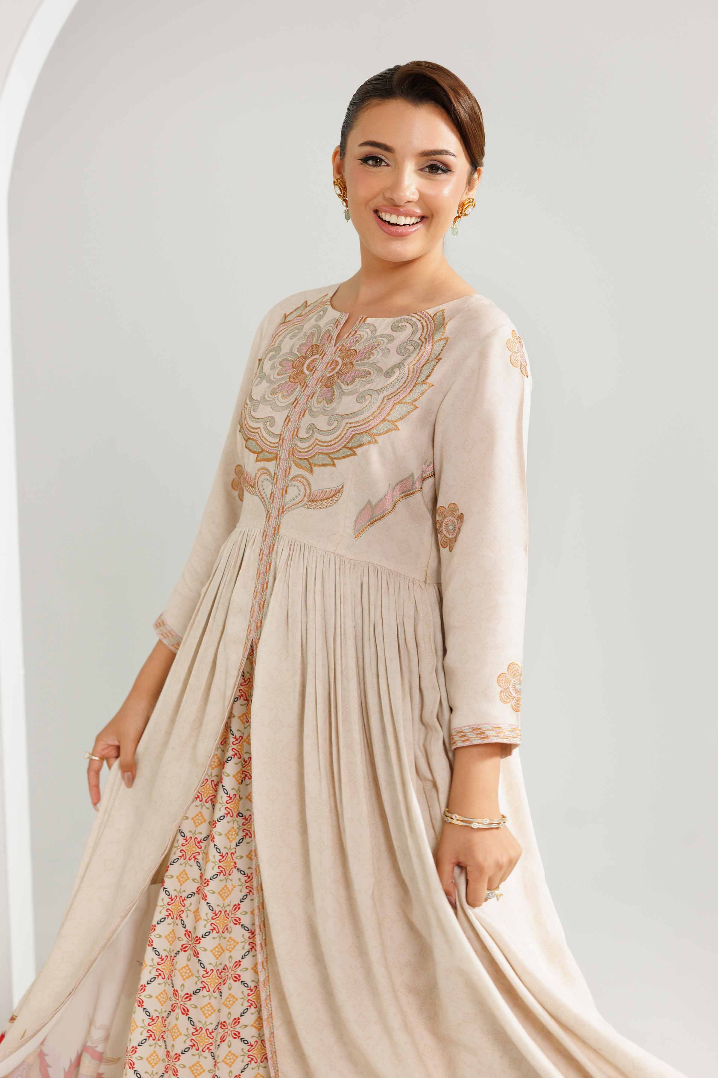 Long Front Open Printed Dress Having Embroidered Bodice And Sleeves.
