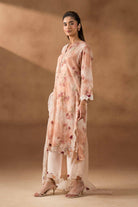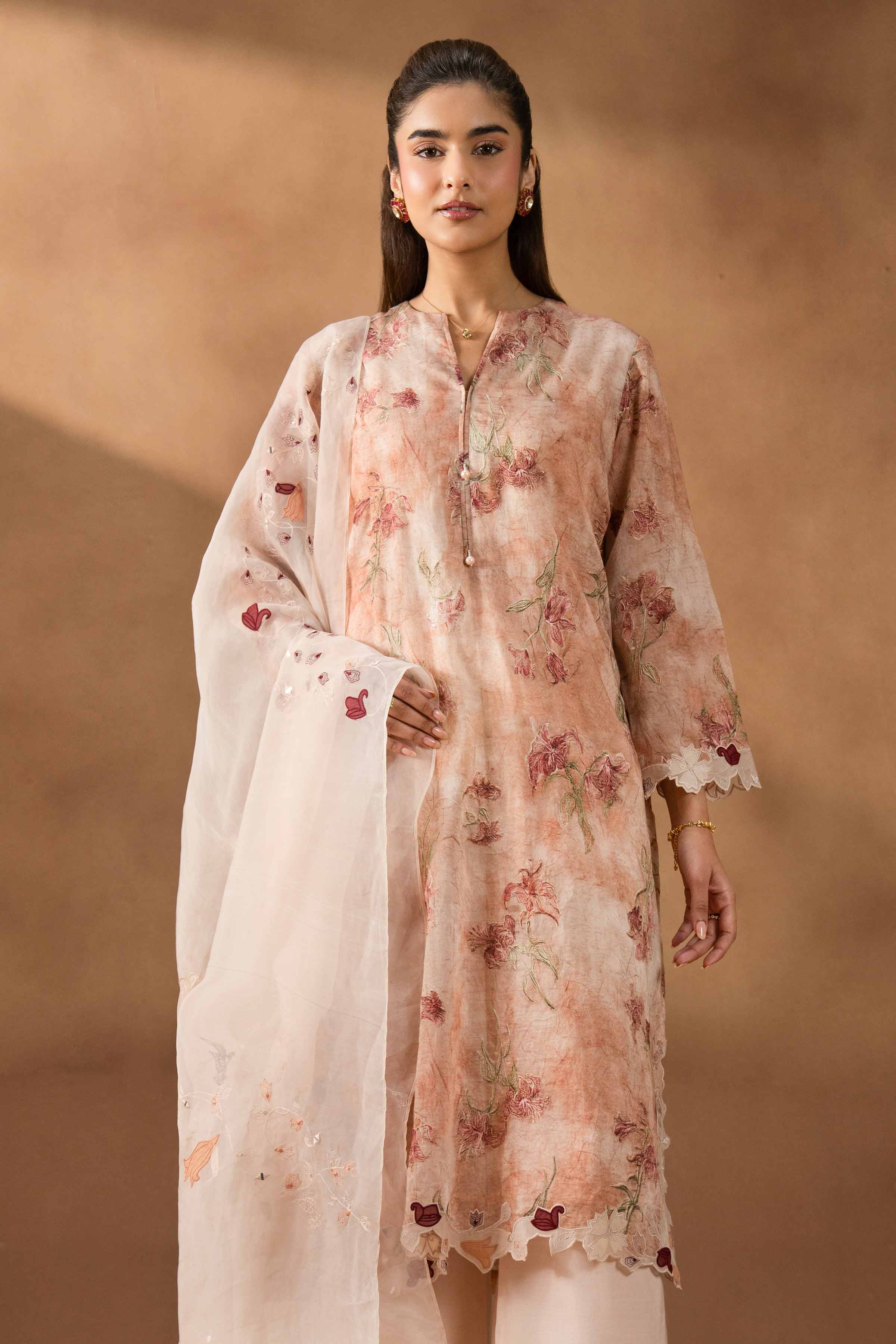 Paper Silk Printed Self-Embroidered Long Shirt Featuring A Round V Neckline With Pearl Detailing On The Front Placket, Enhanced With Organza Embroidered Patches On The Hem And Sleeve Hems.