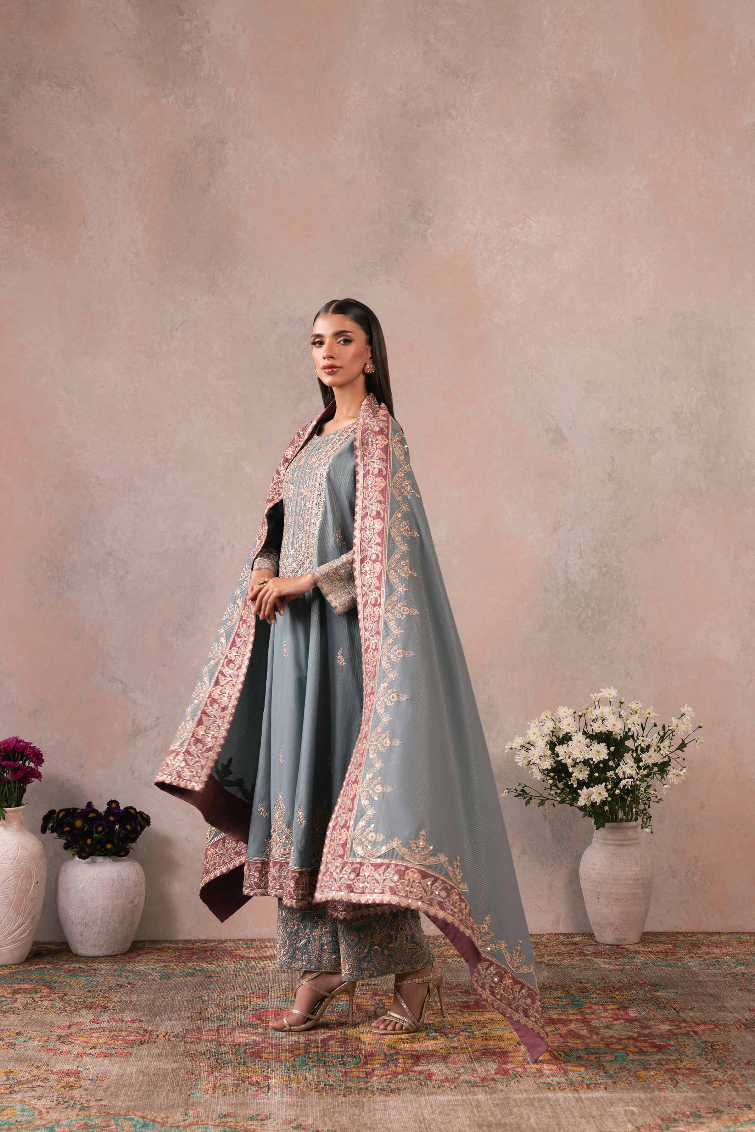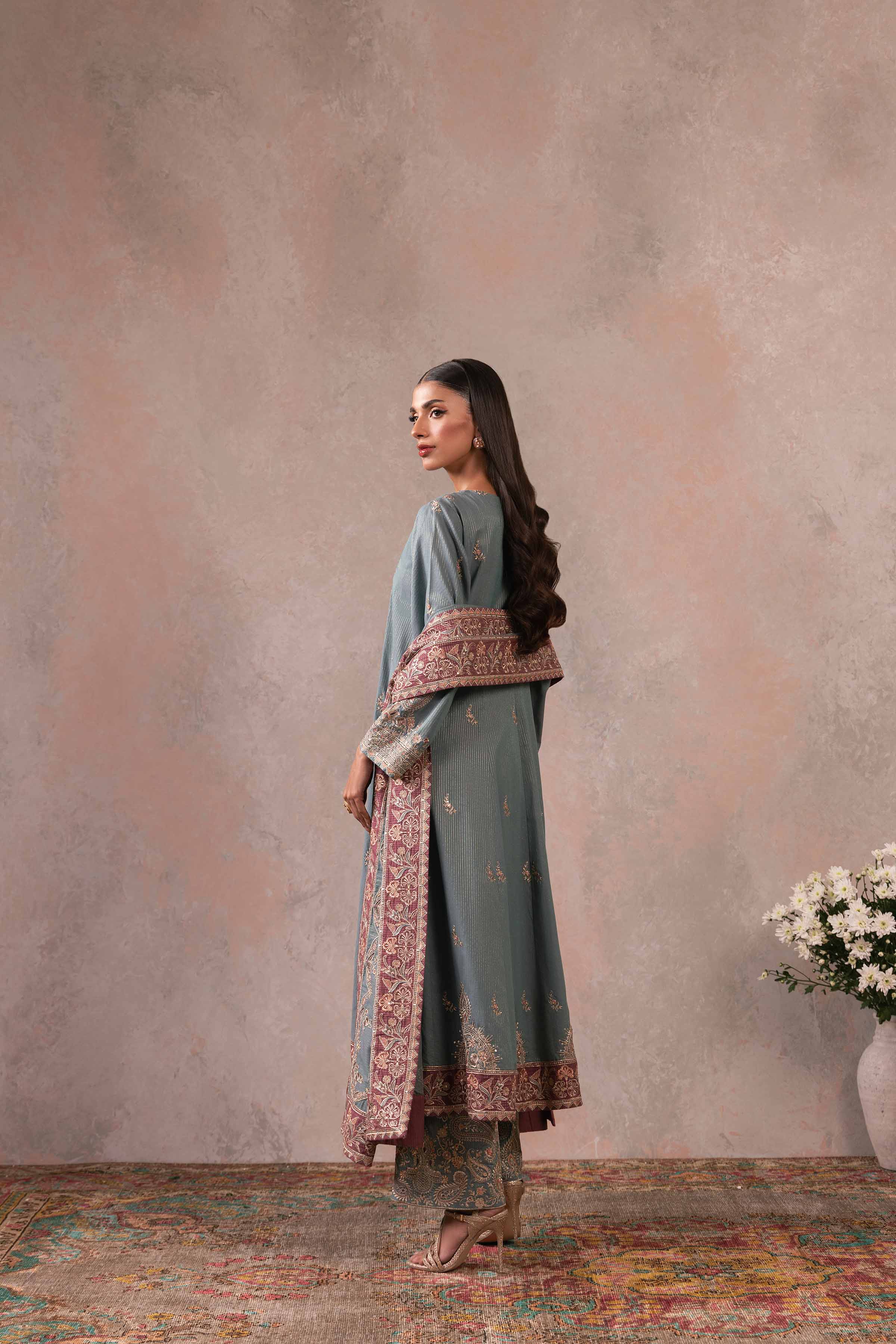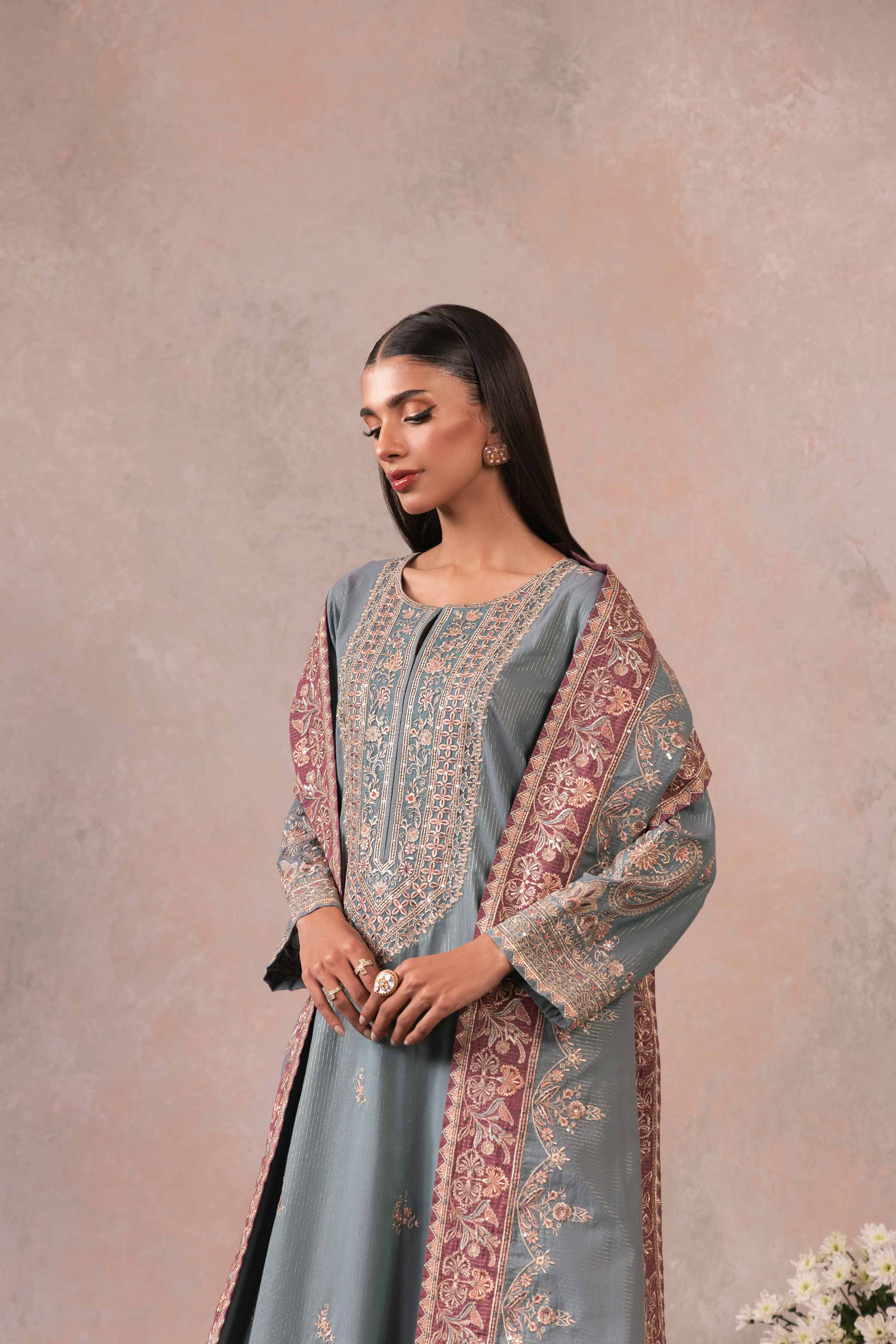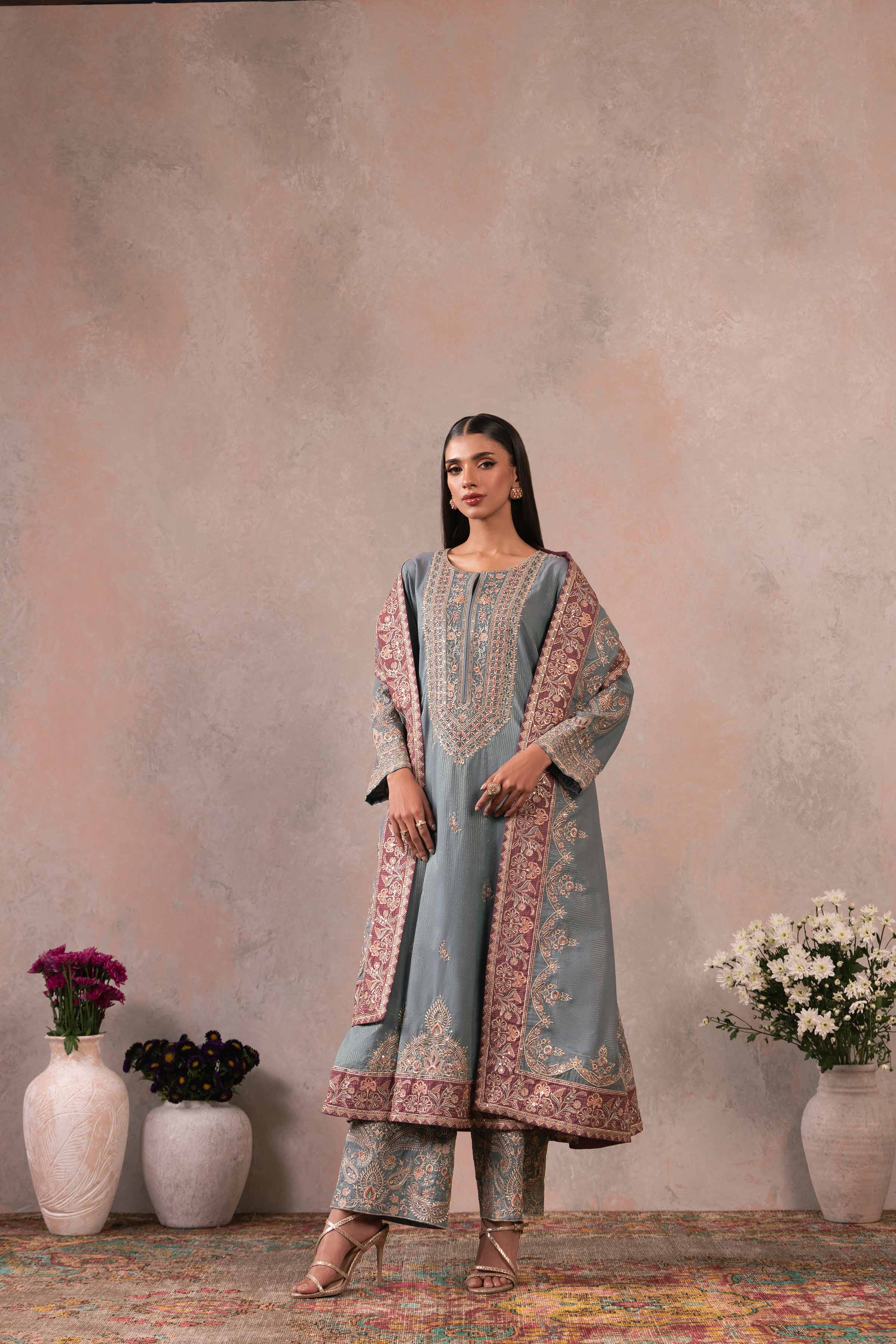 Effortlessly capture hearts with our embroidered three-piece suit from the latest rawayat collection.