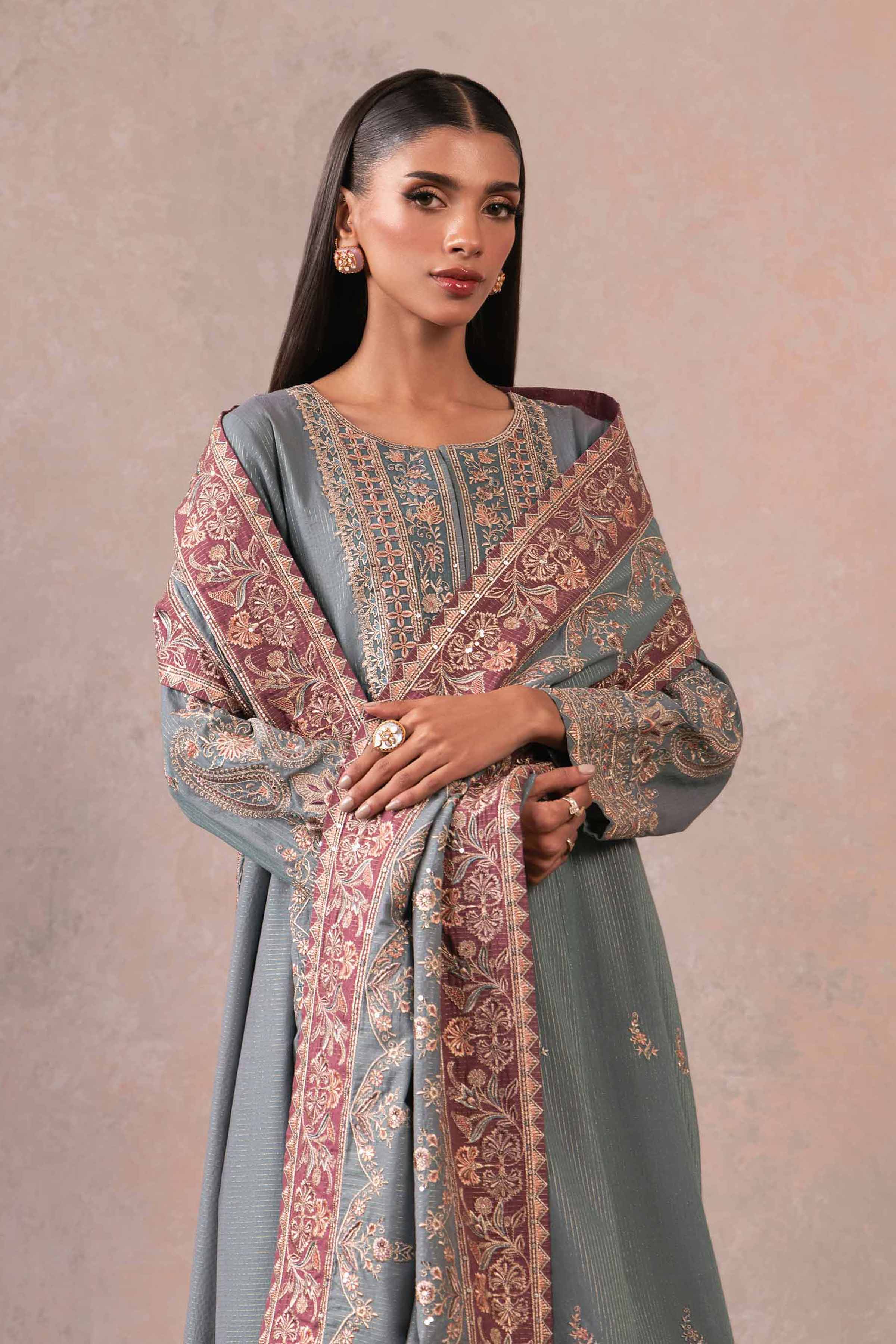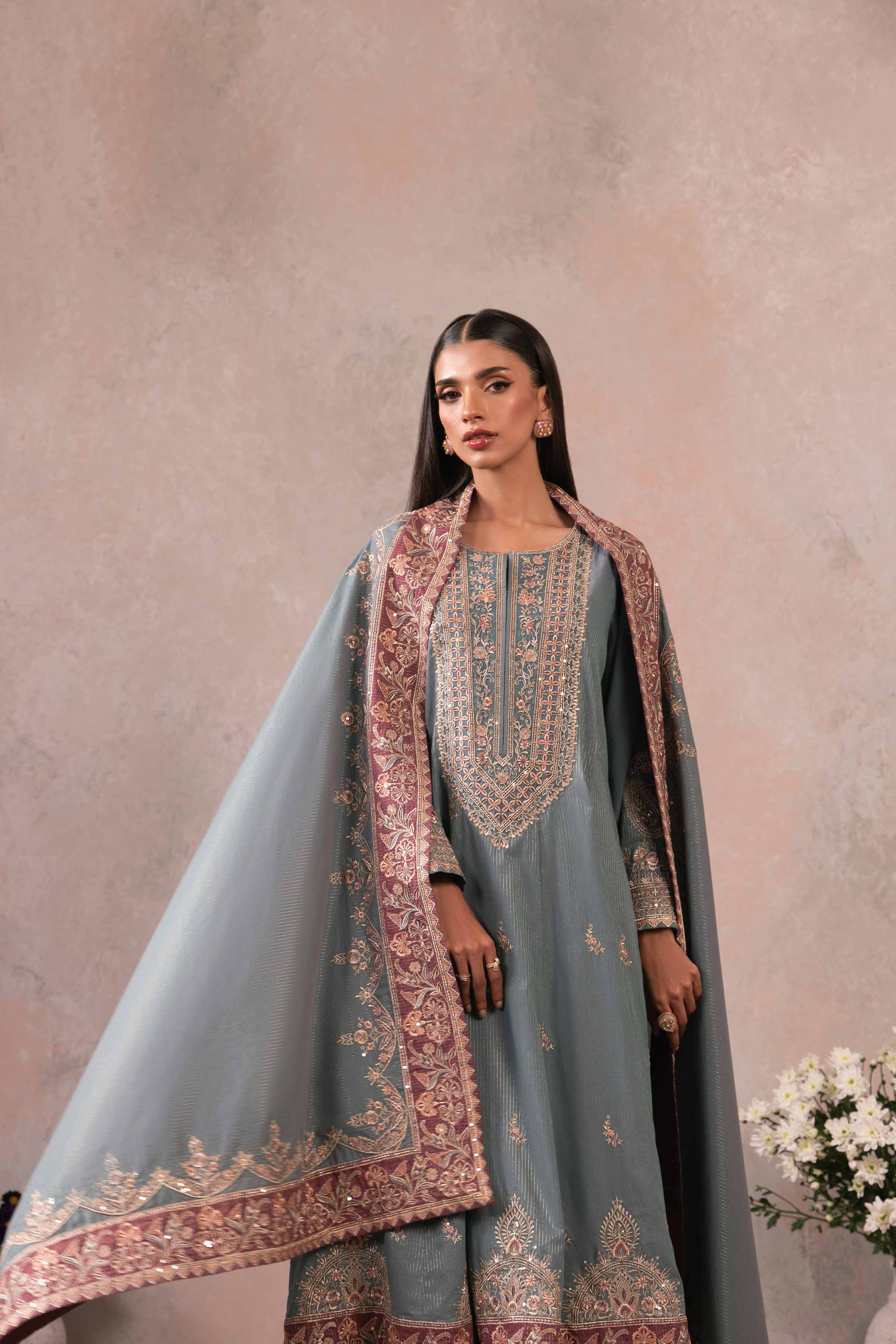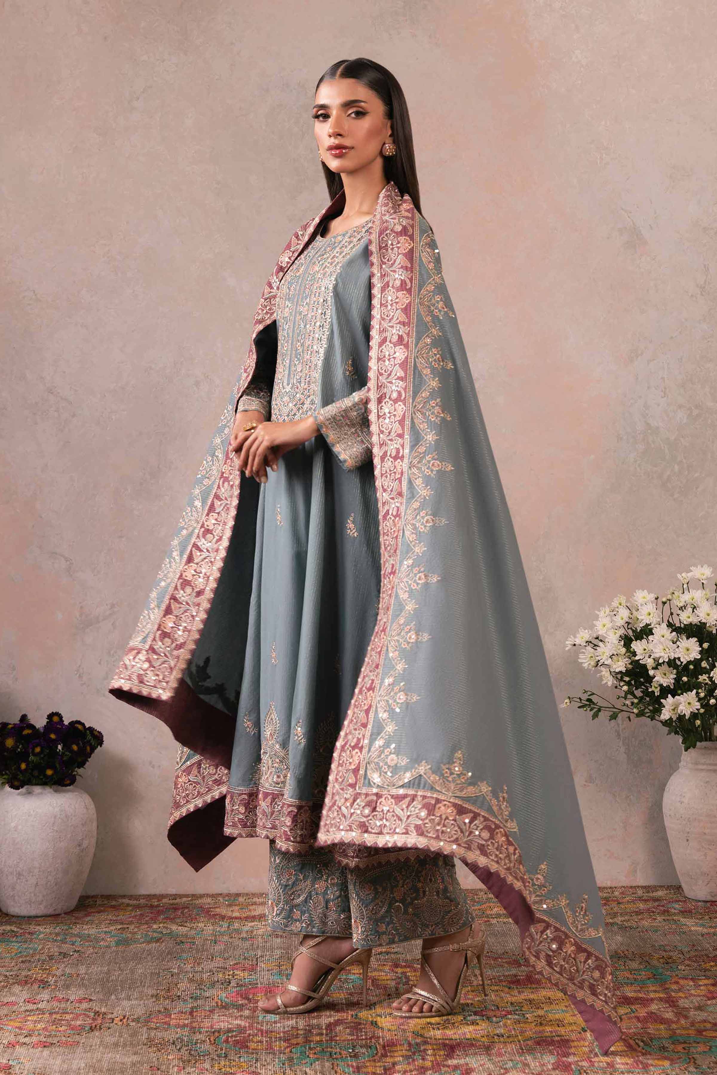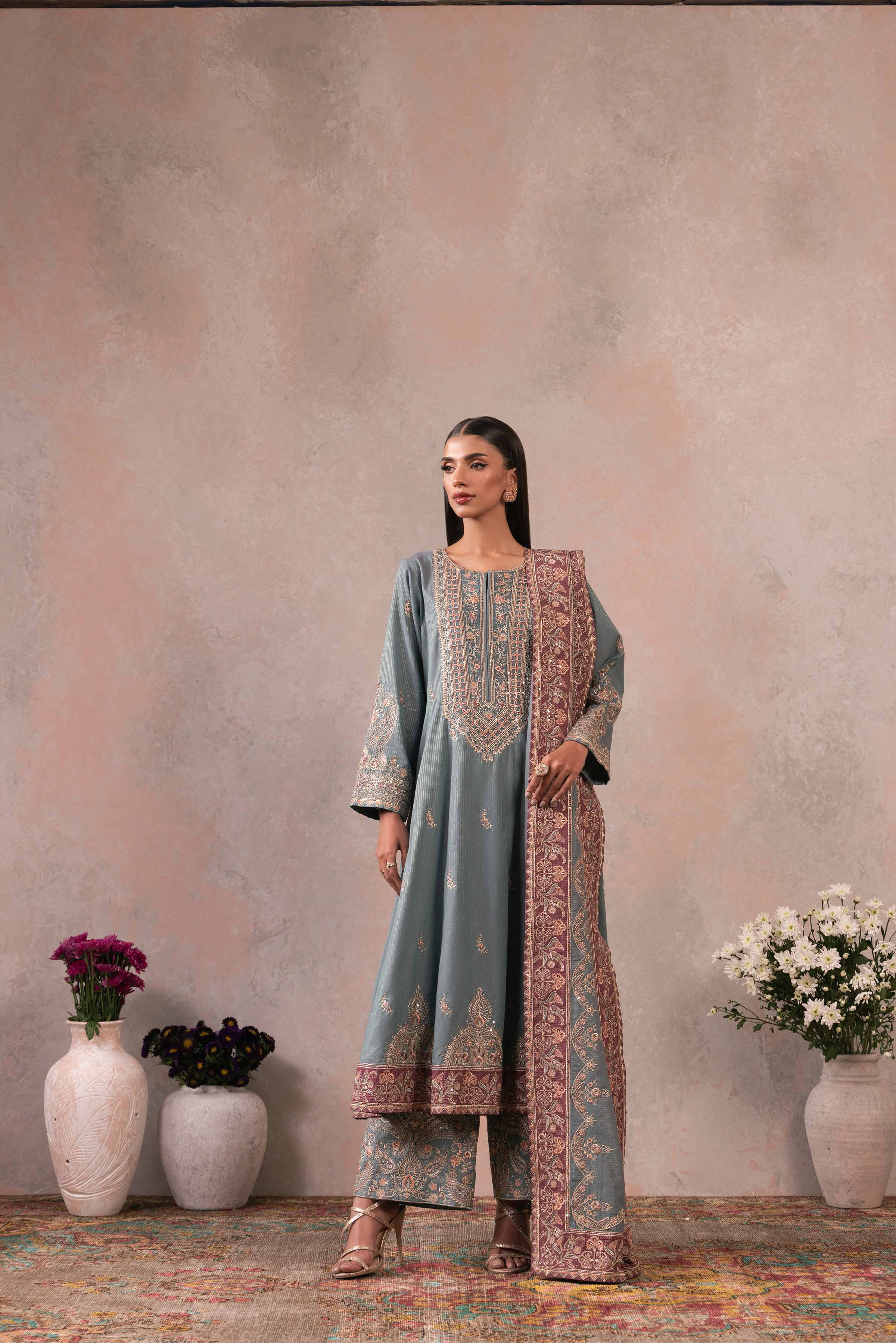 Effortlessly capture hearts with our embroidered three-piece suit from the latest rawayat collection.