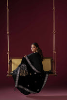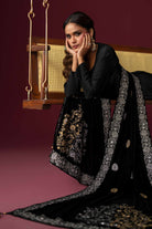 Stand alone velvet embroidered shawl embellished with tilla and badla work, enhanced with fancy tassels.