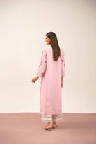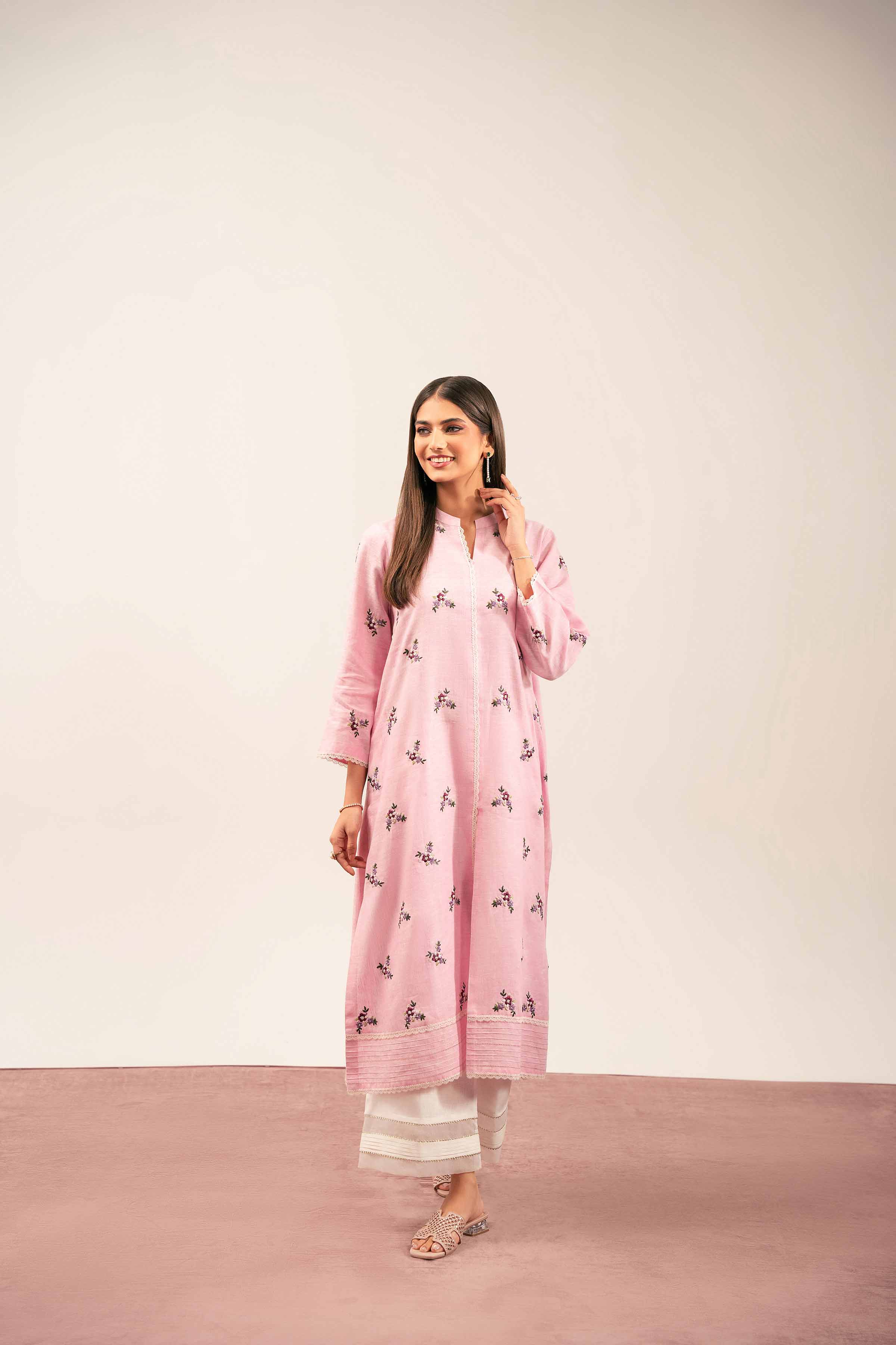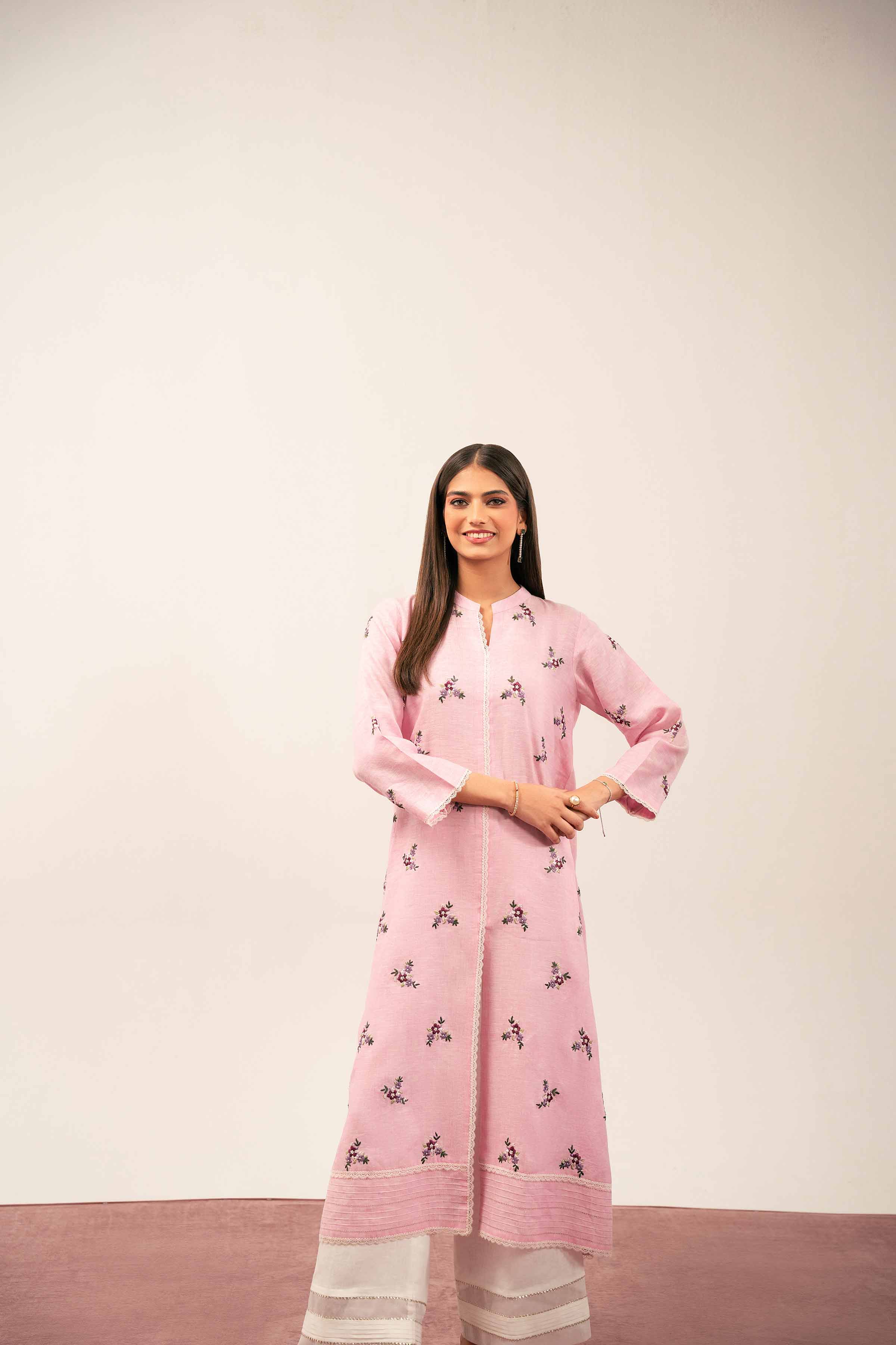 Band Neckline With Slit, Lace Detail At Front, Sleeves Edges & Hem, Front Open A-Line Shirt