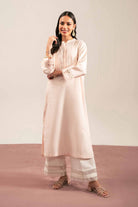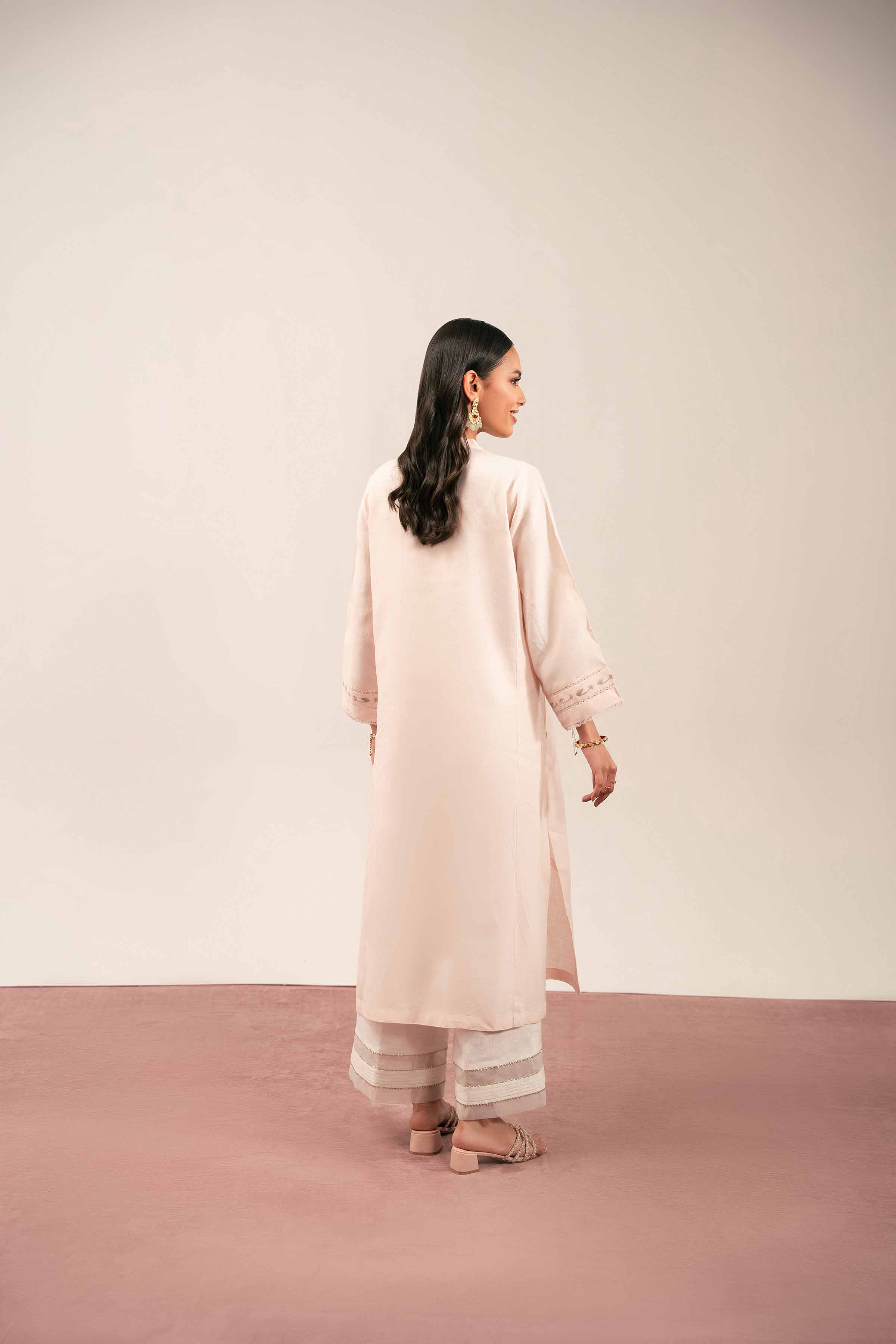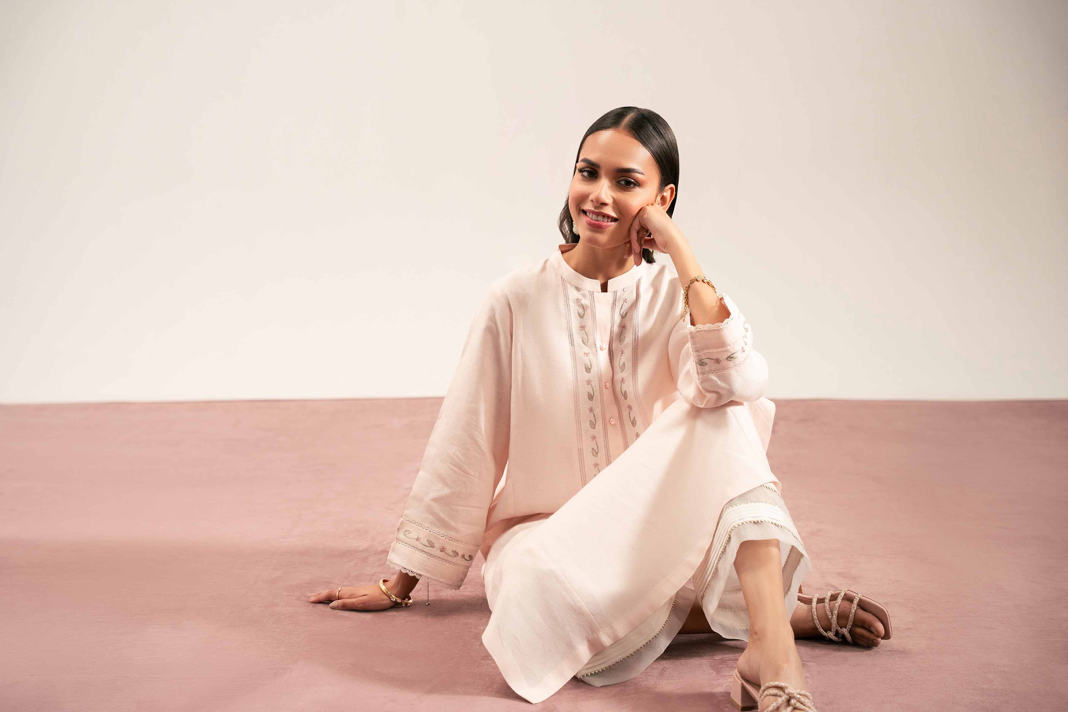 Band Neckline With Buttons Detail On Placket, Embroidered Neckline & Sleeves, Long Shirt