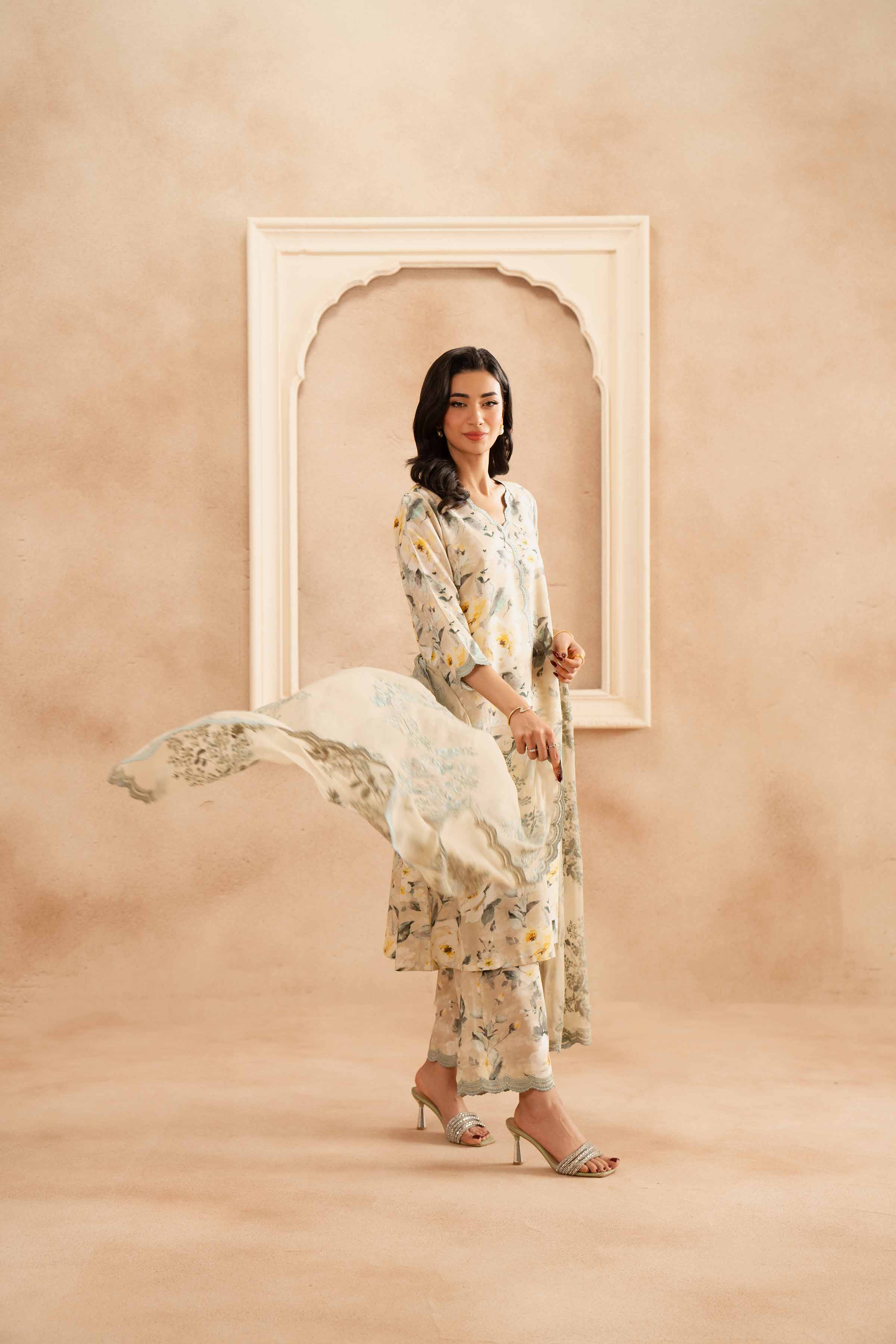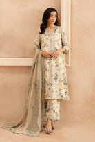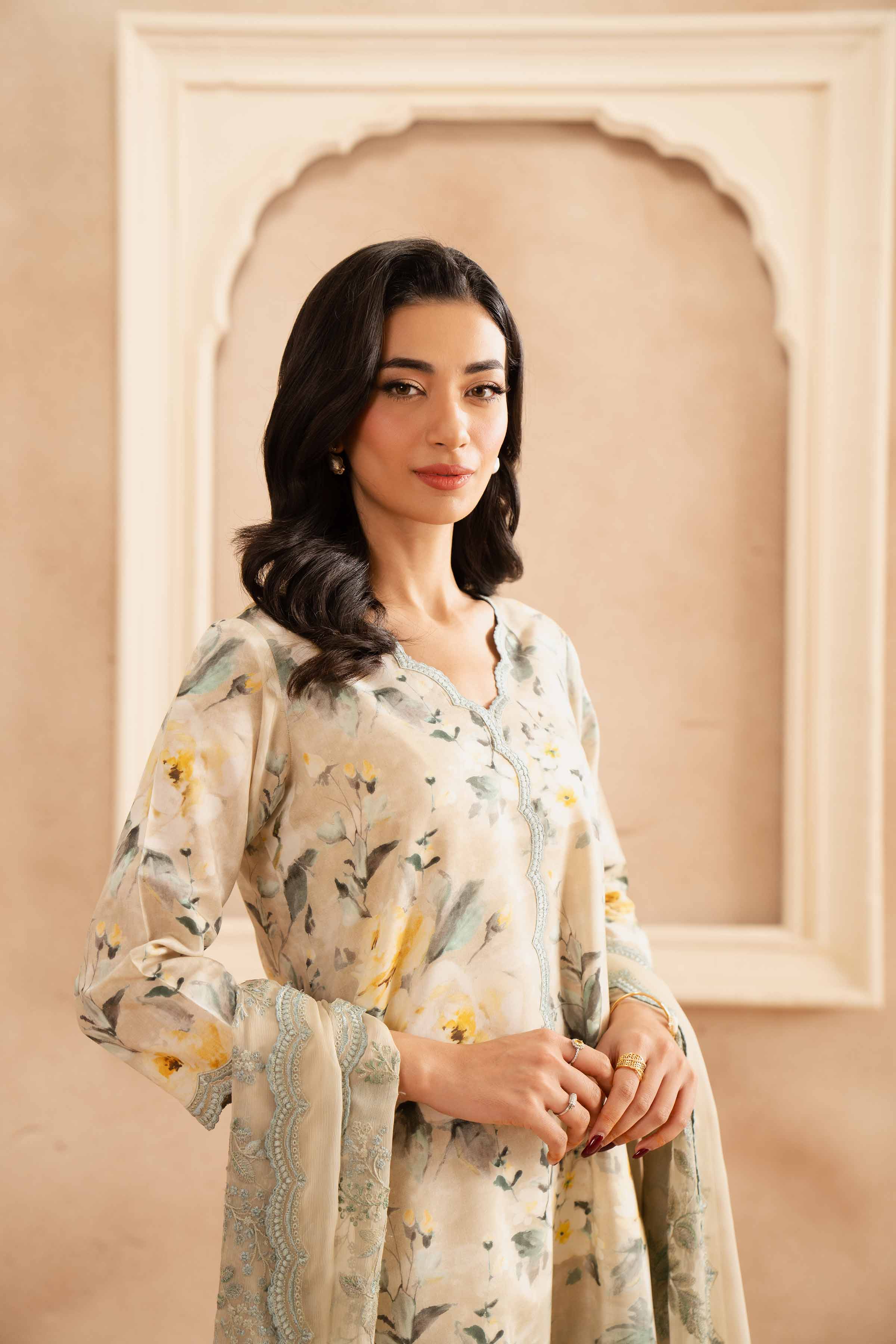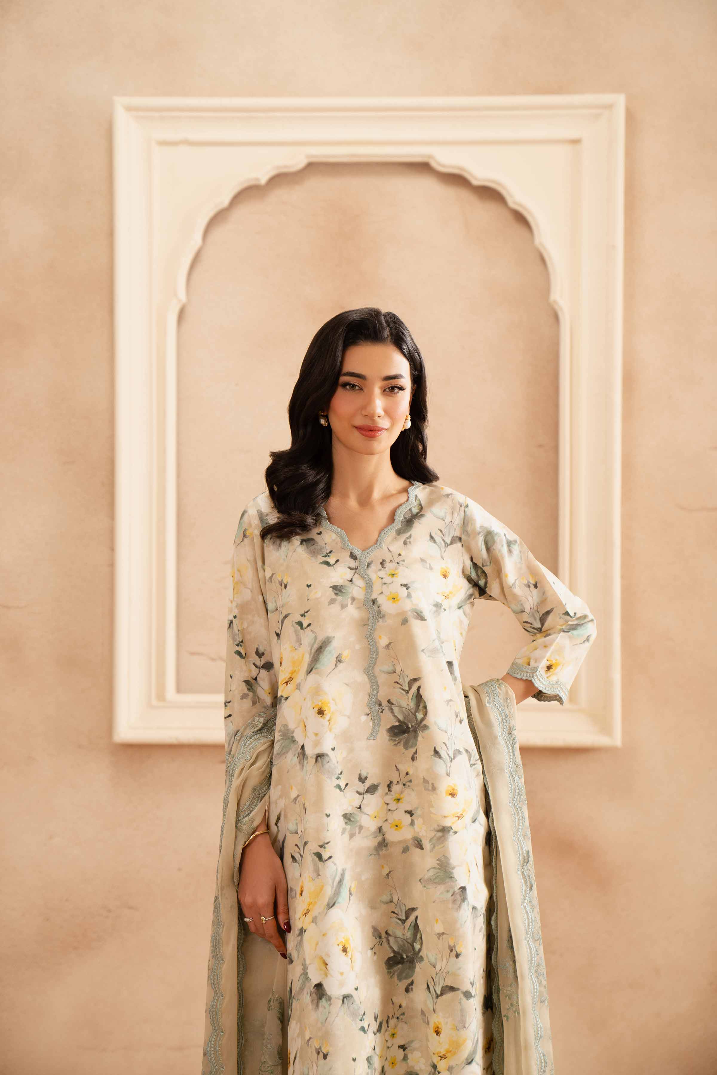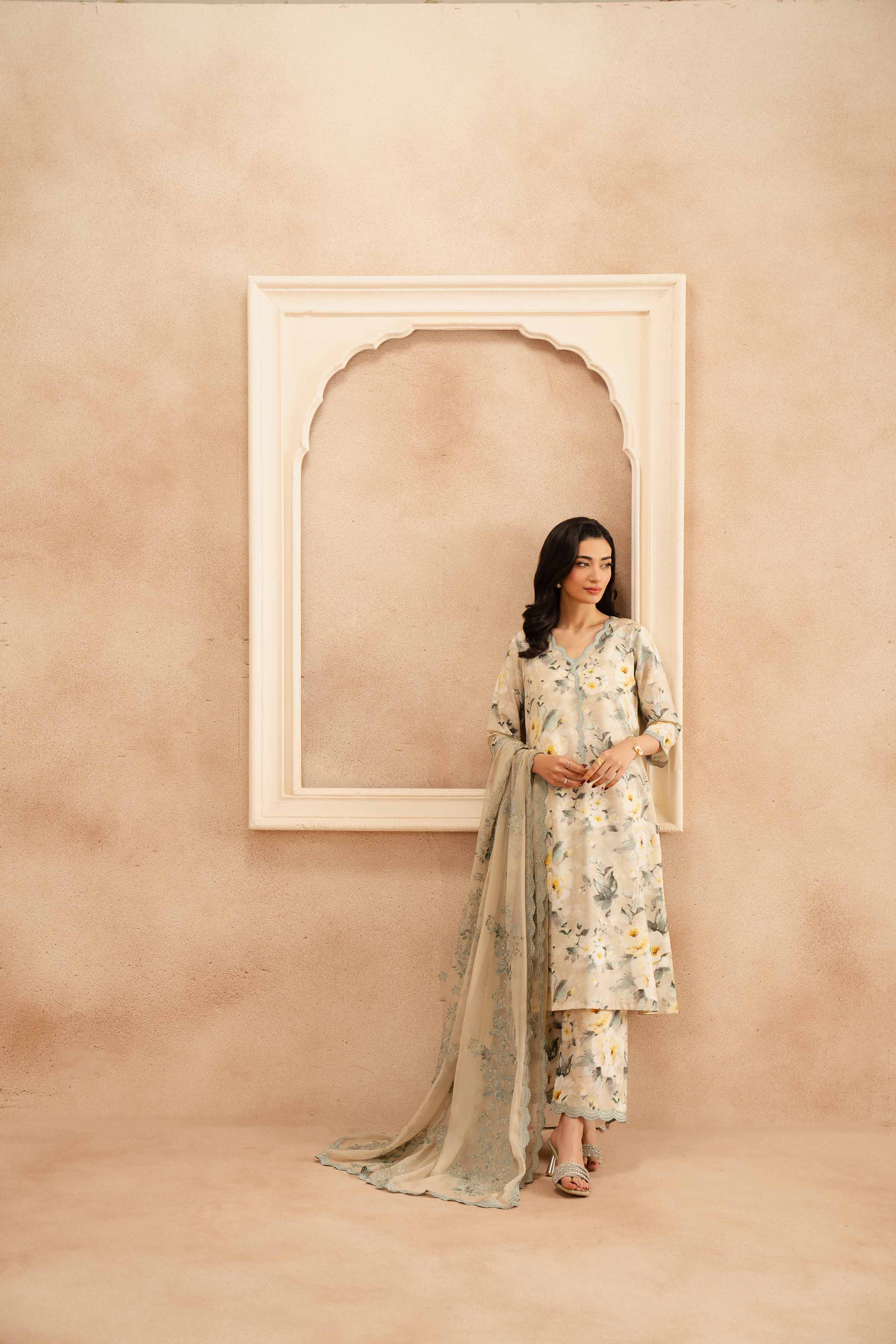 Effortlessly capture hearts with our printed embroidered three-piece suit from the latest rawayat collection.