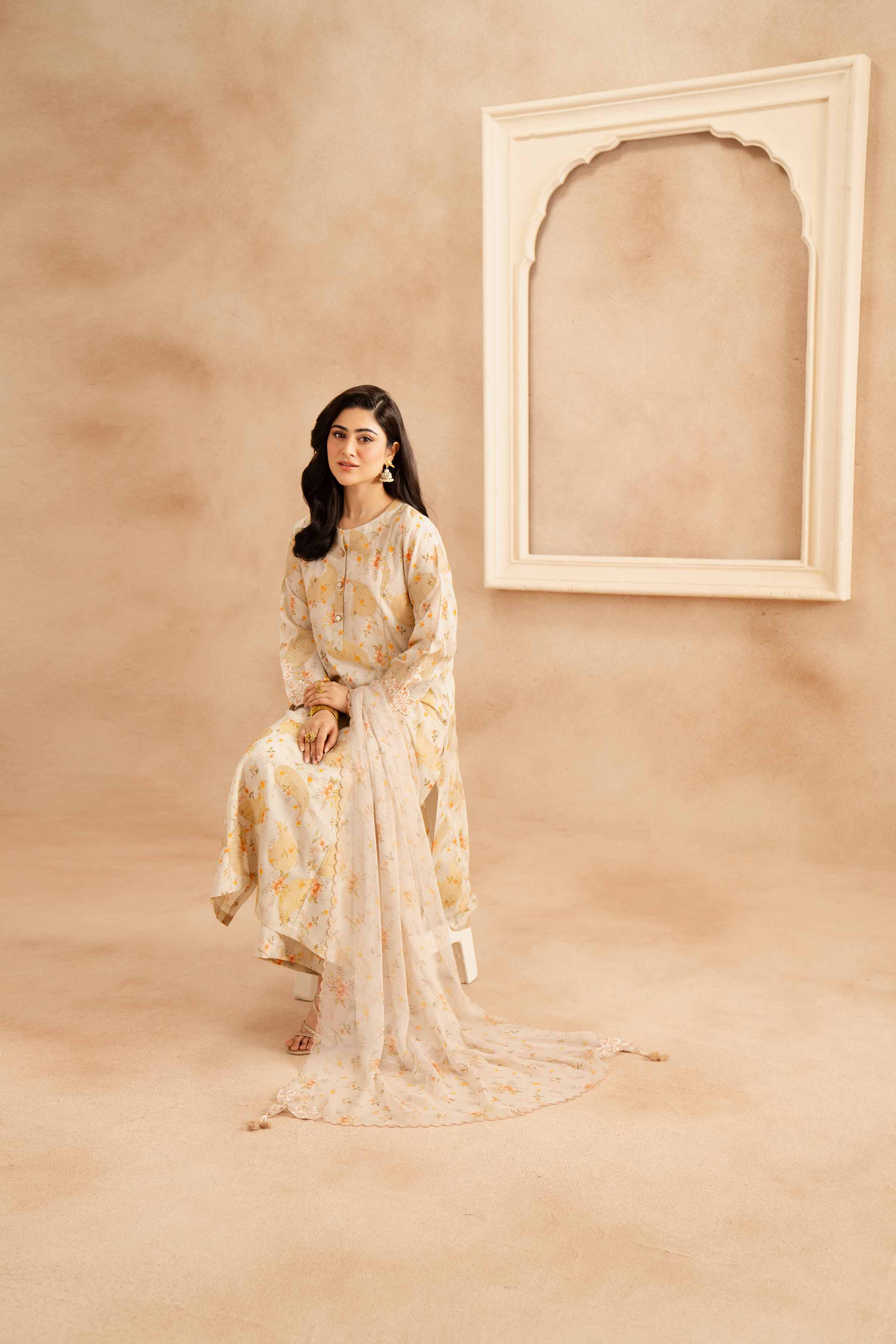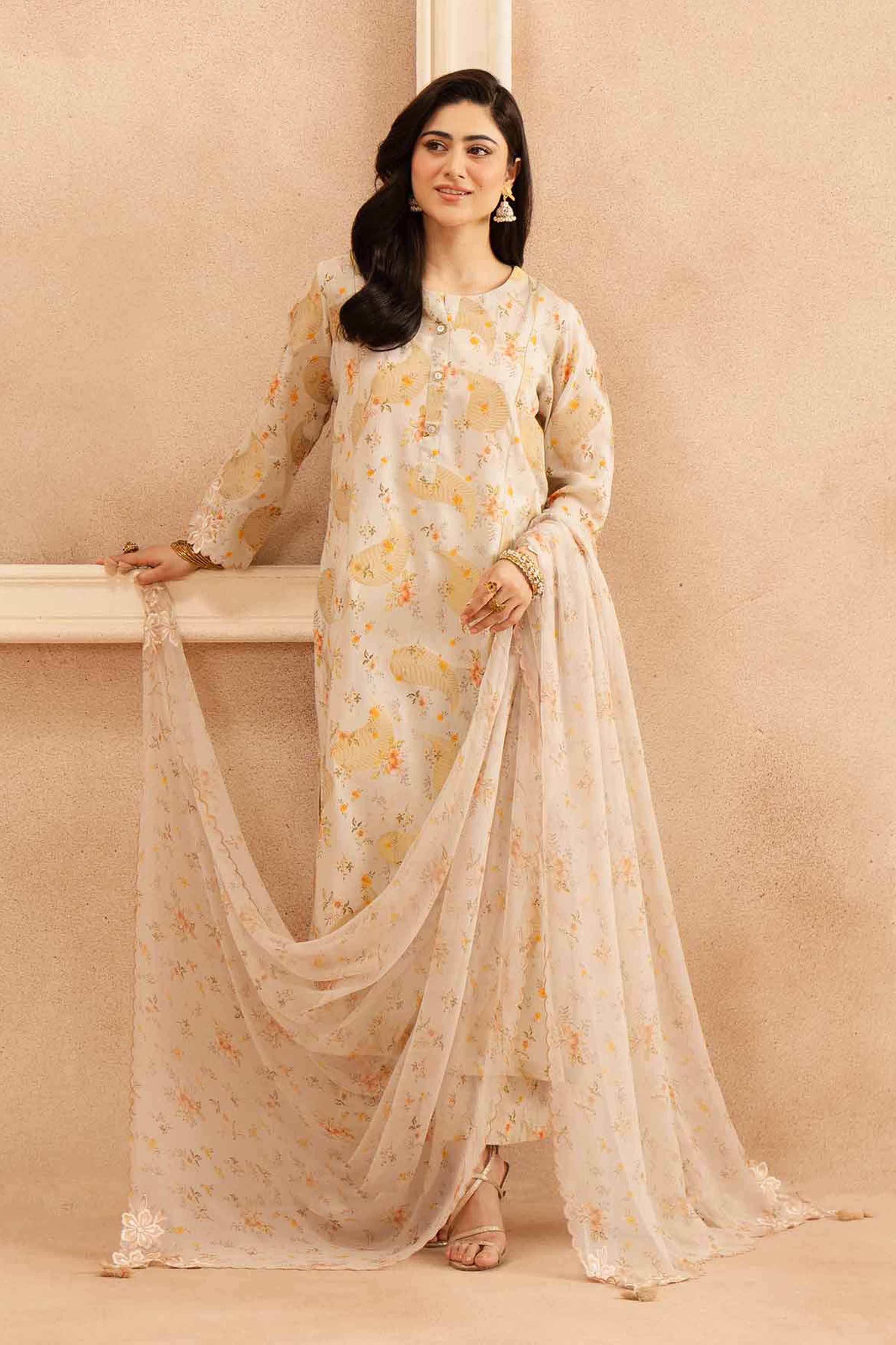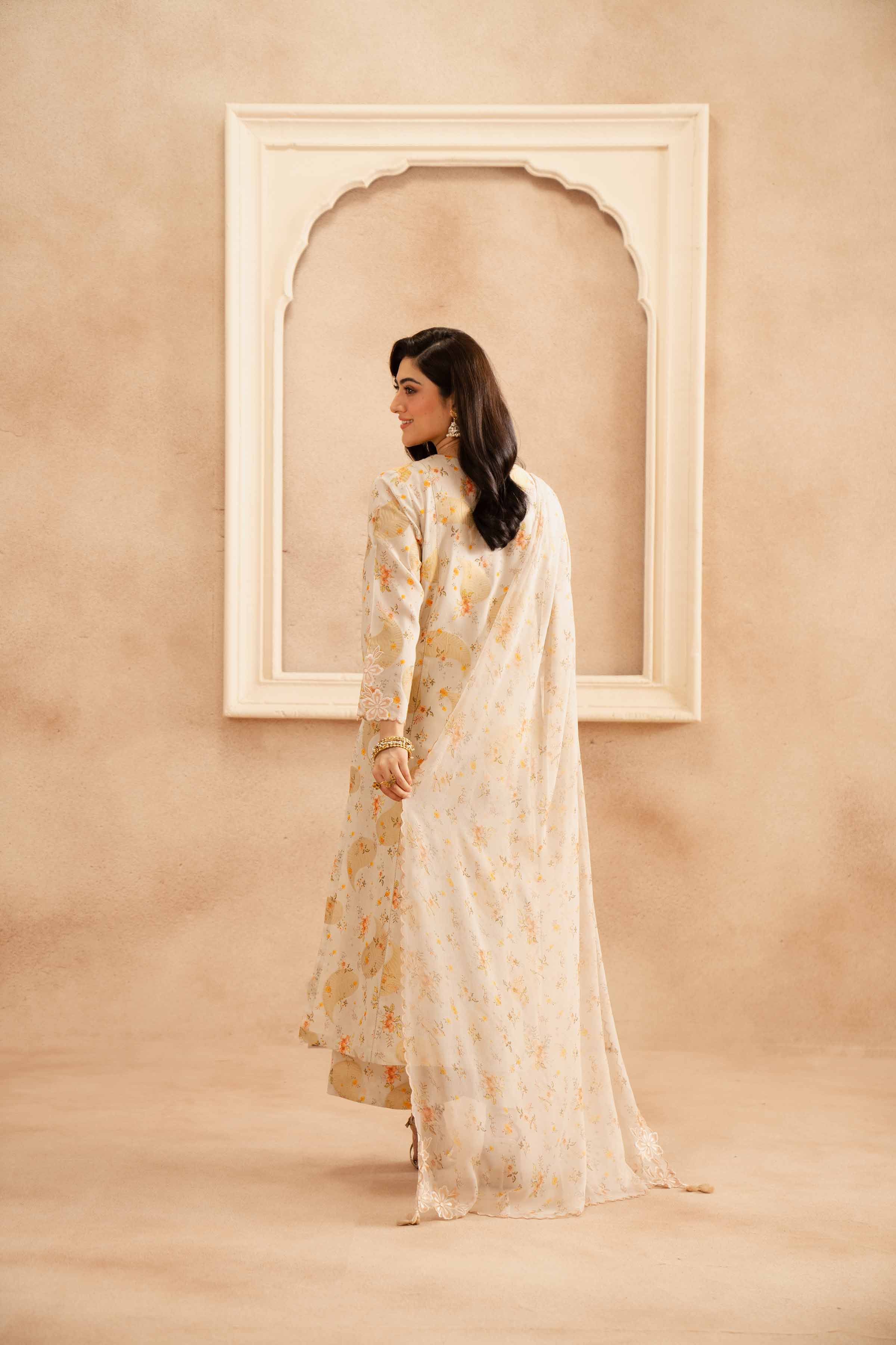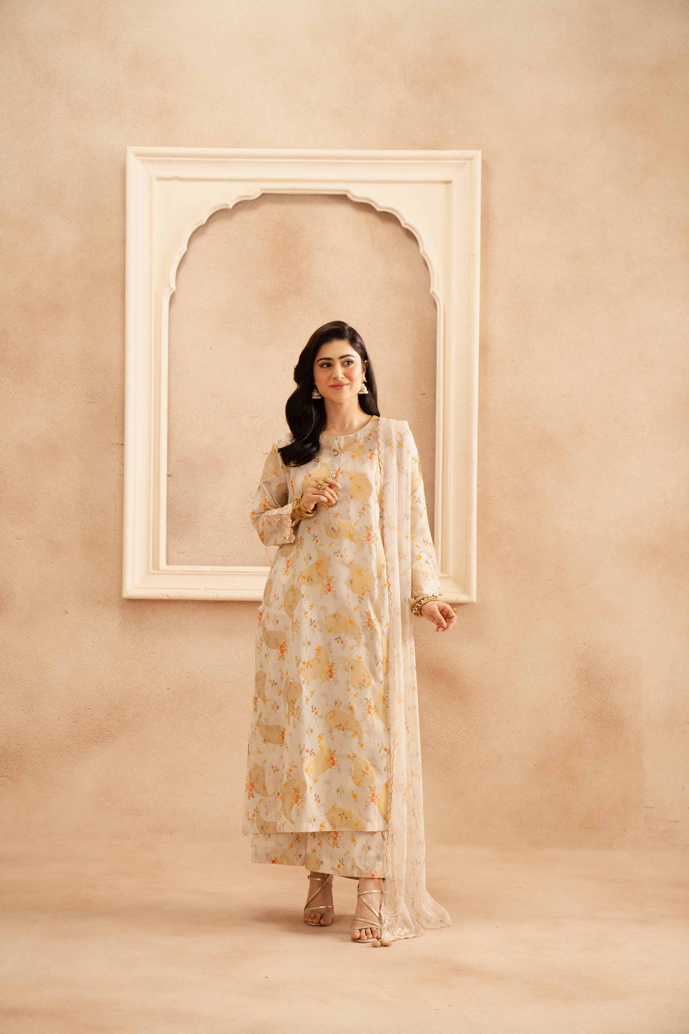 Effortlessly capture hearts with our printed embroidered three-piece suit from the latest rawayat collection.