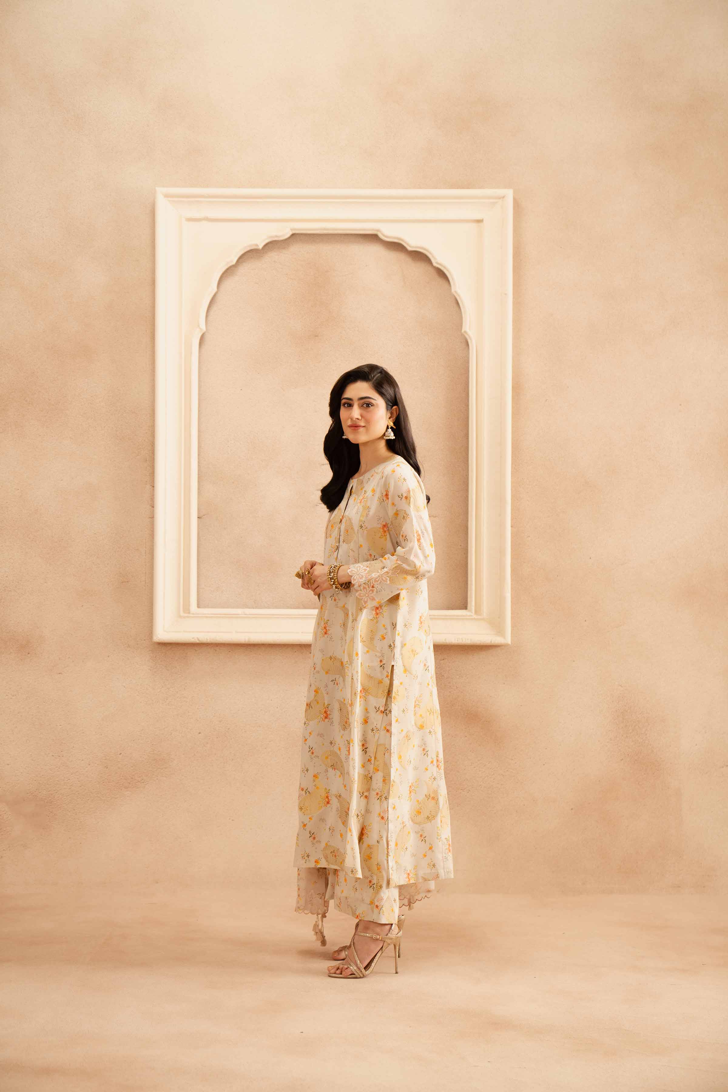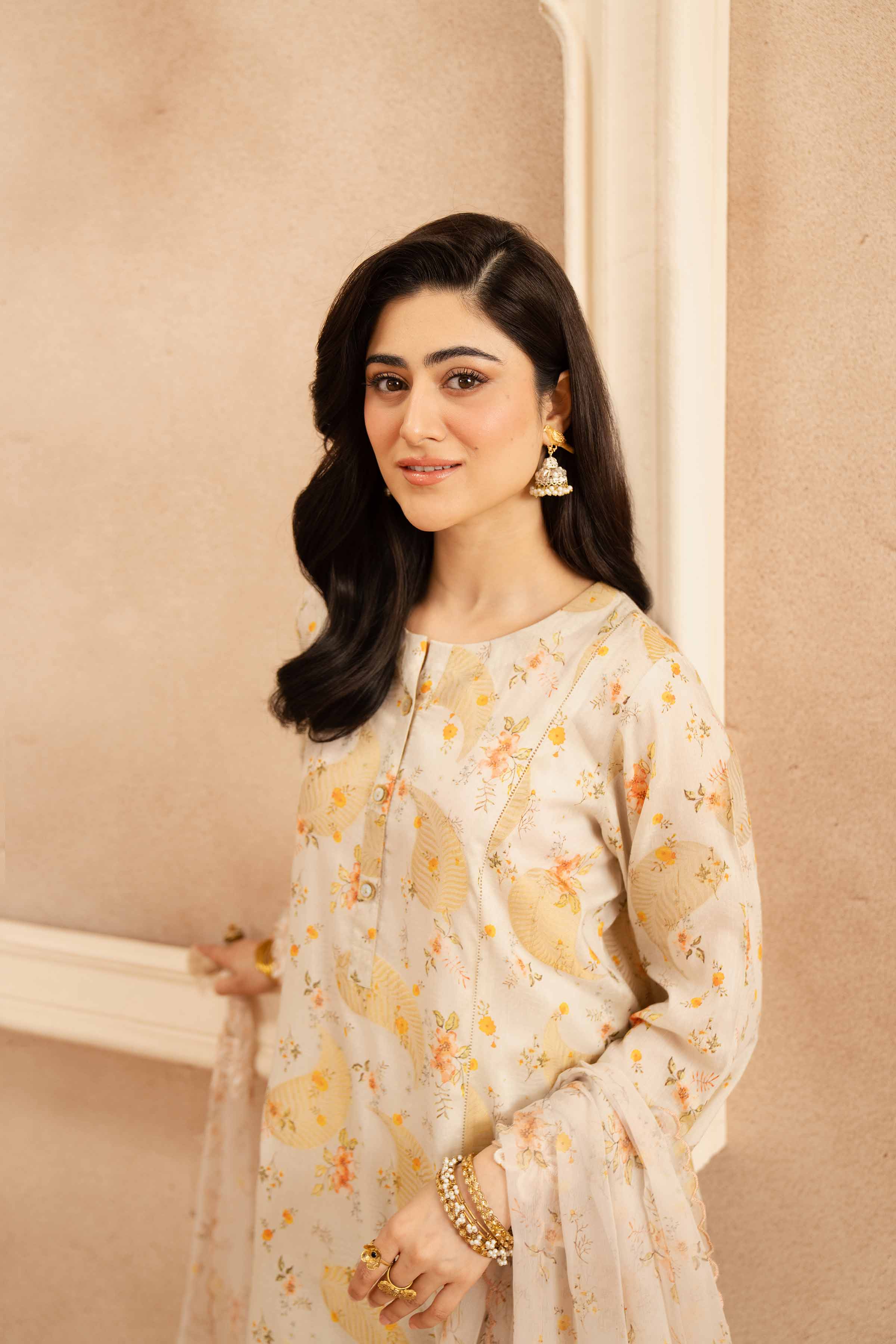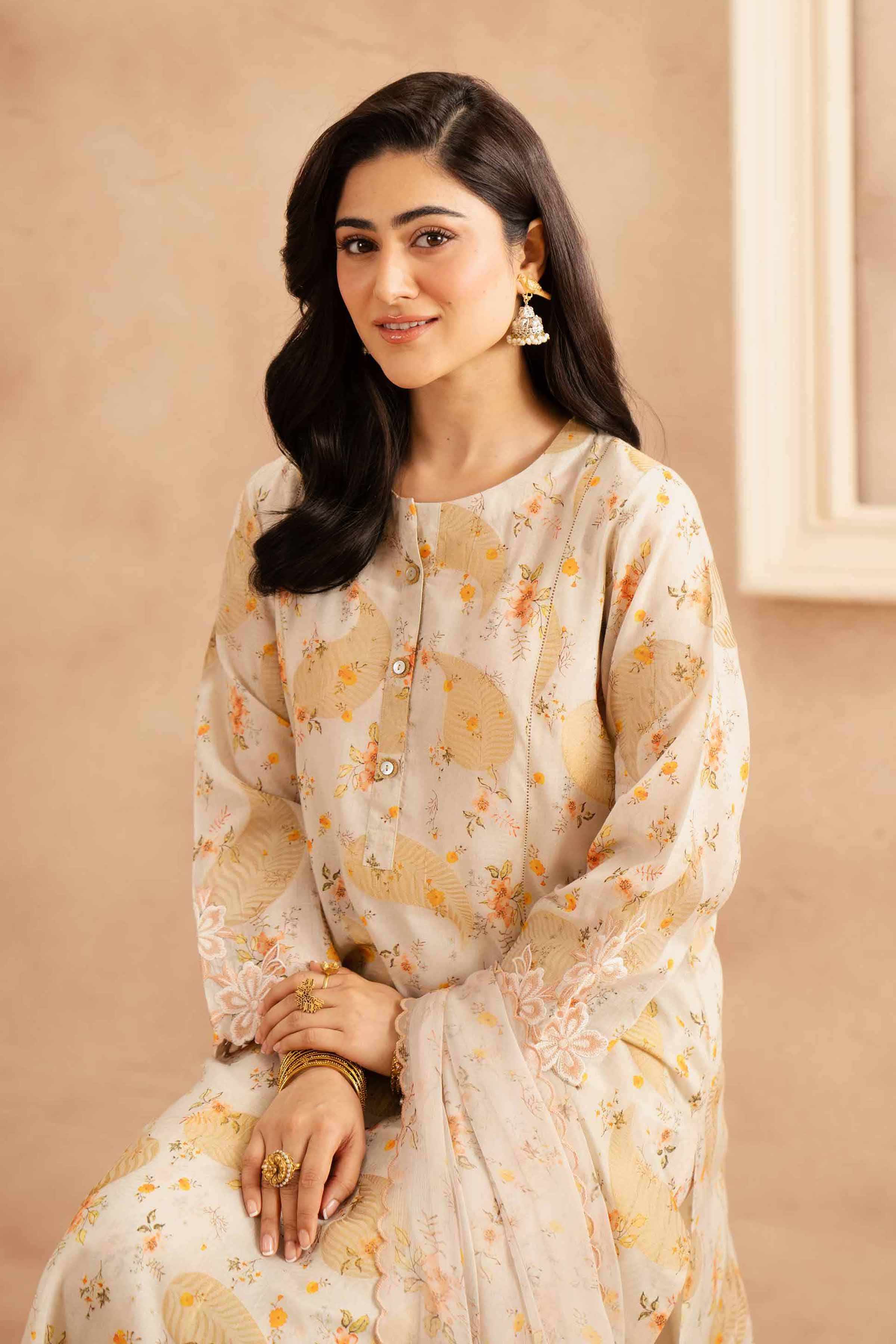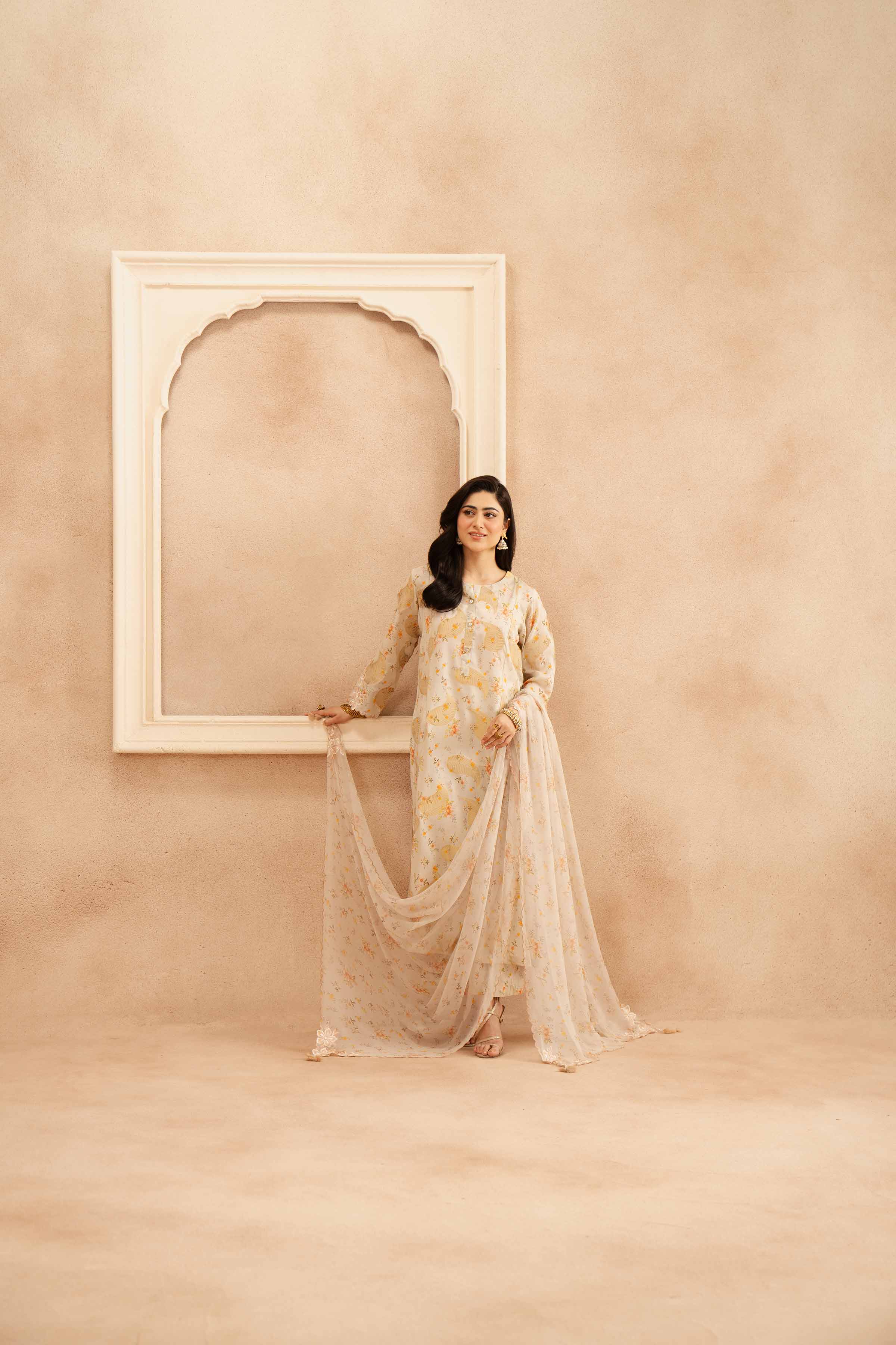Effortlessly capture hearts with our printed embroidered three-piece suit from the latest rawayat collection.