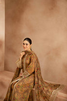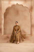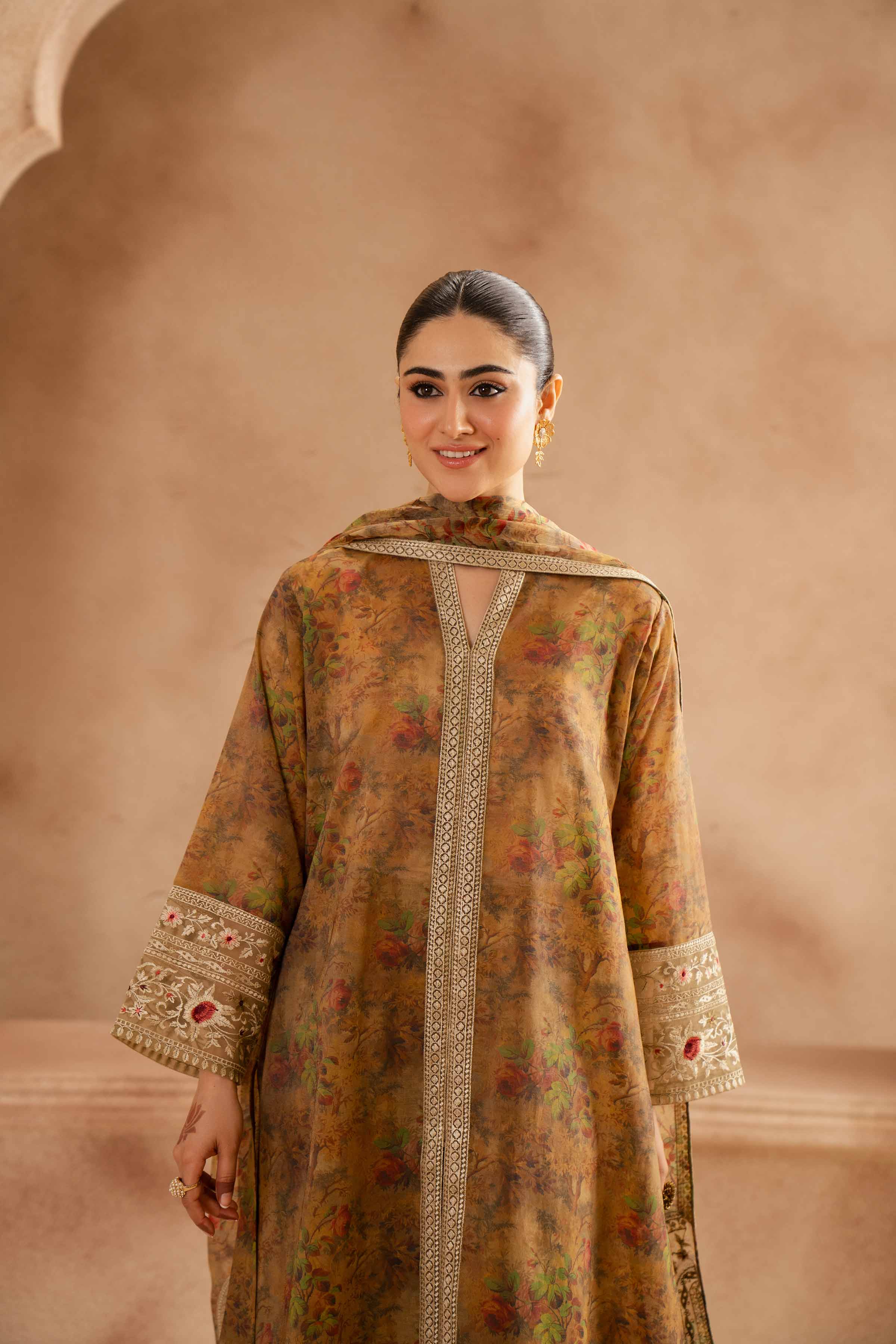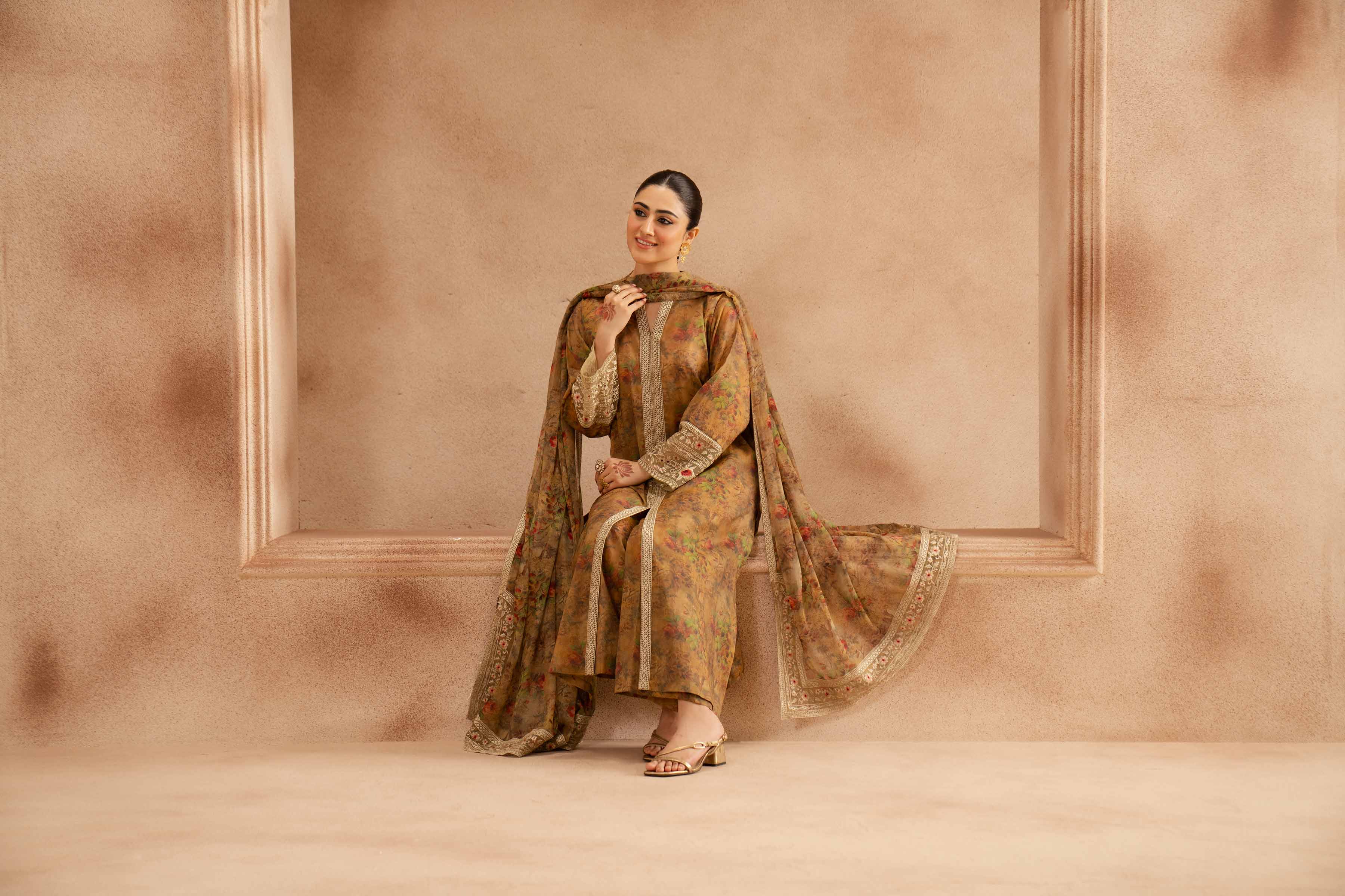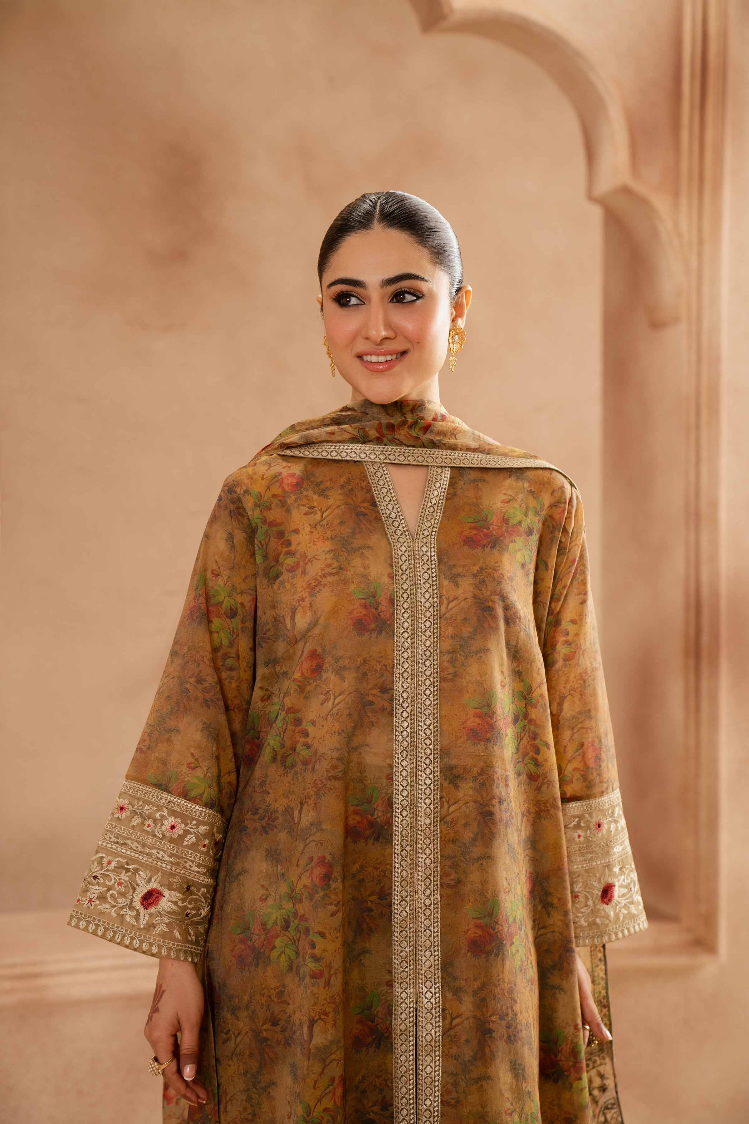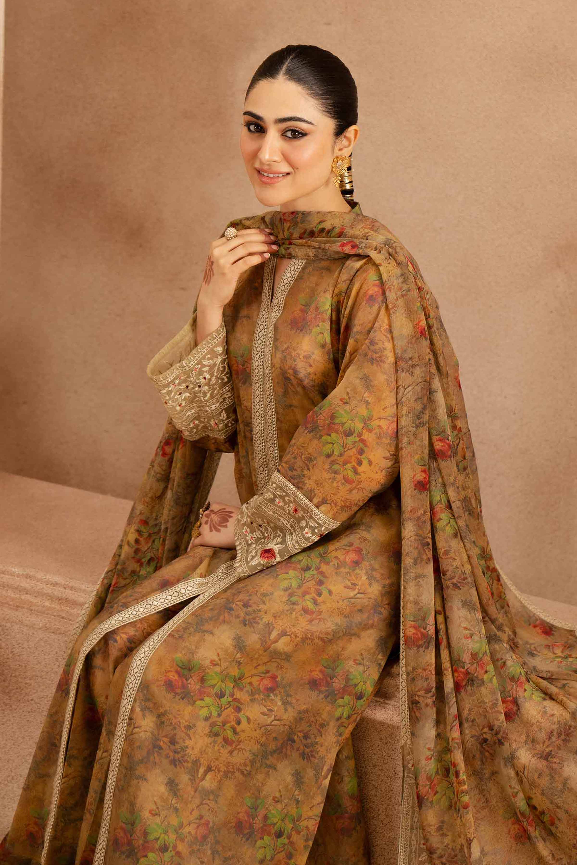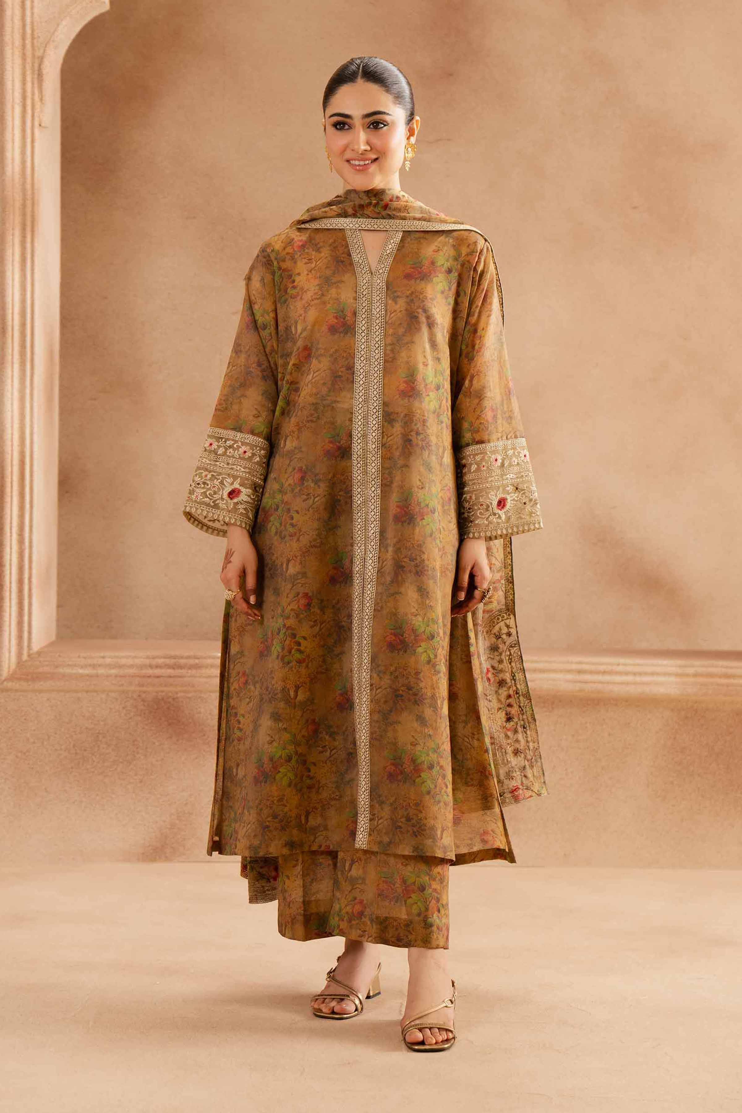 Effortlessly capture hearts with our printed embroidered three-piece suit from the latest rawayat collection.