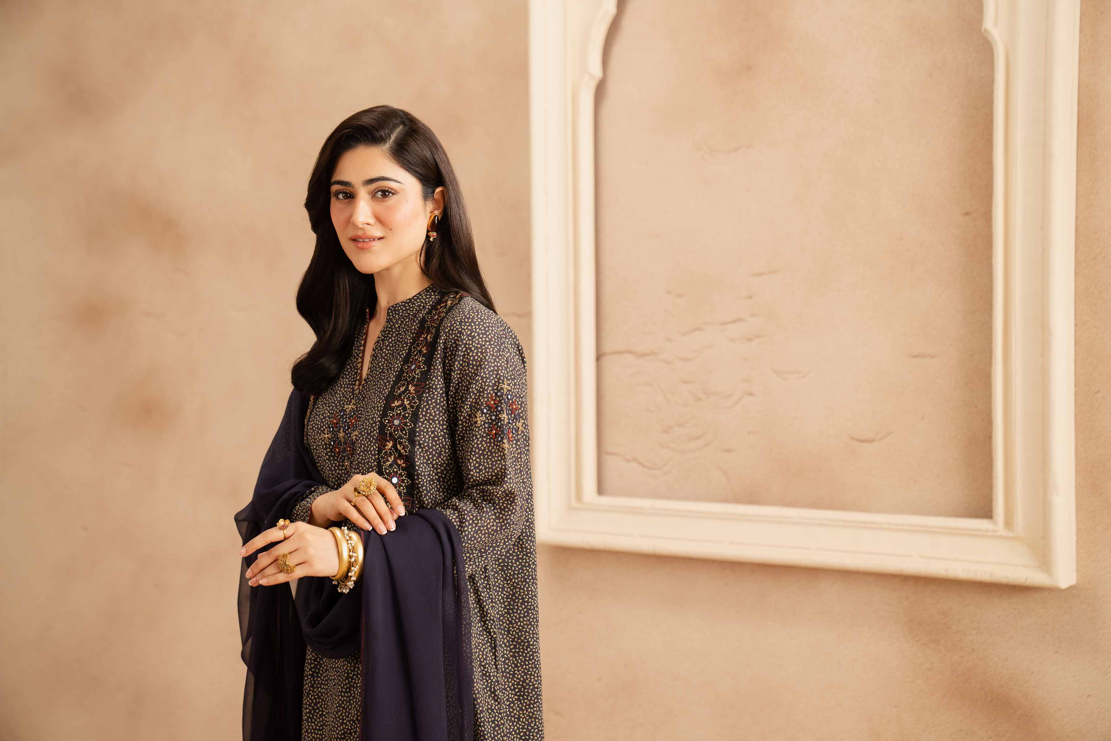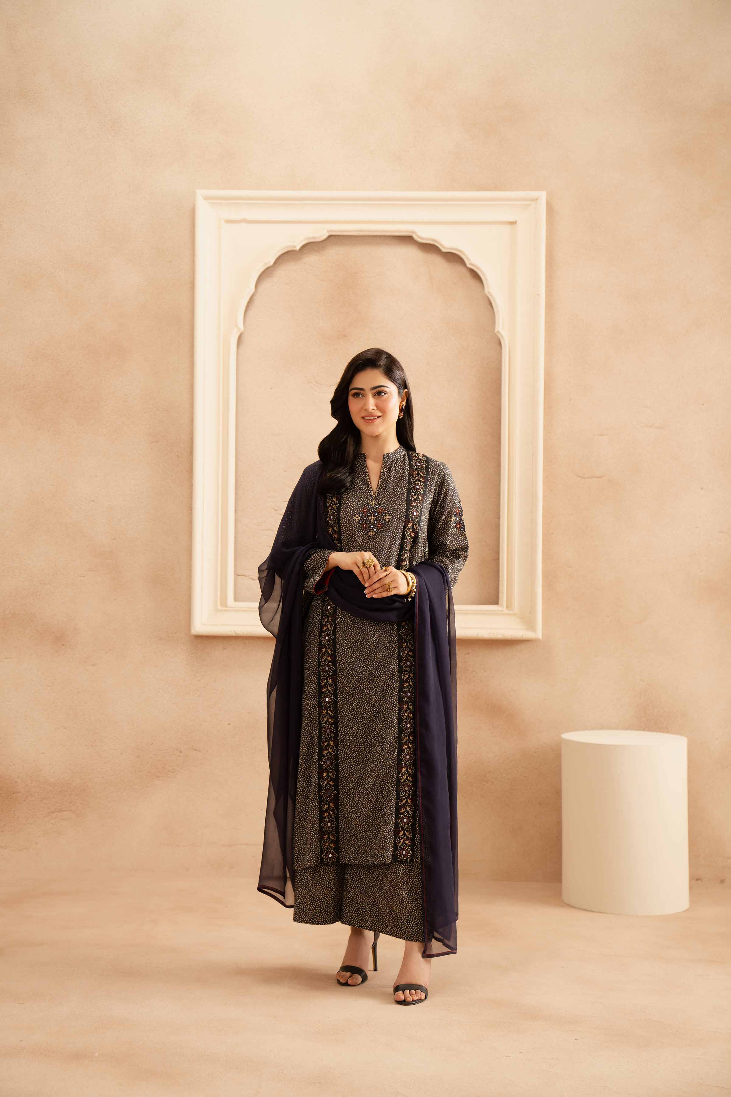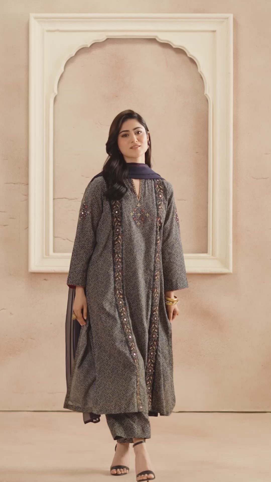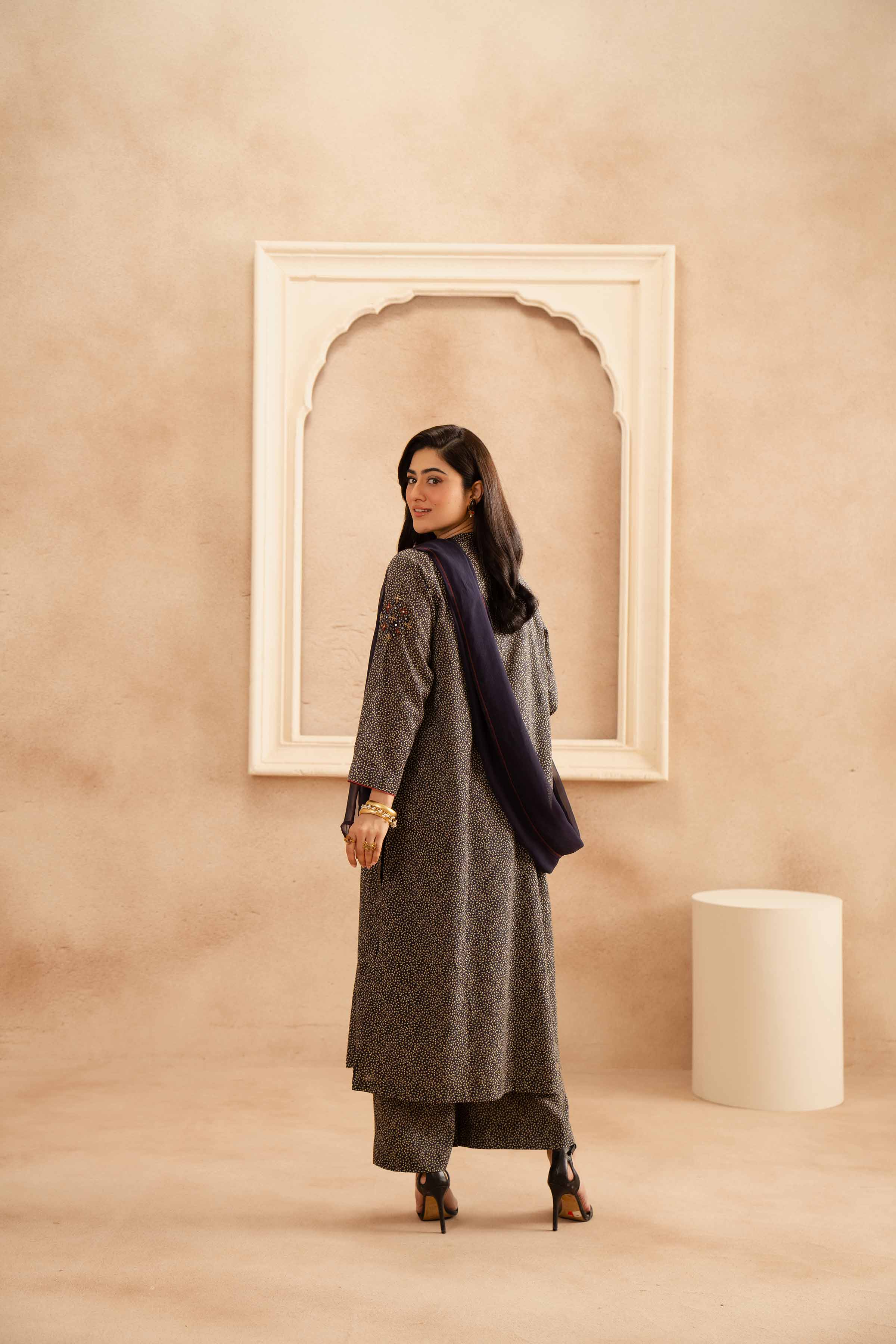 Effortlessly capture hearts with our printed three-piece suit from the latest rawayat collection.