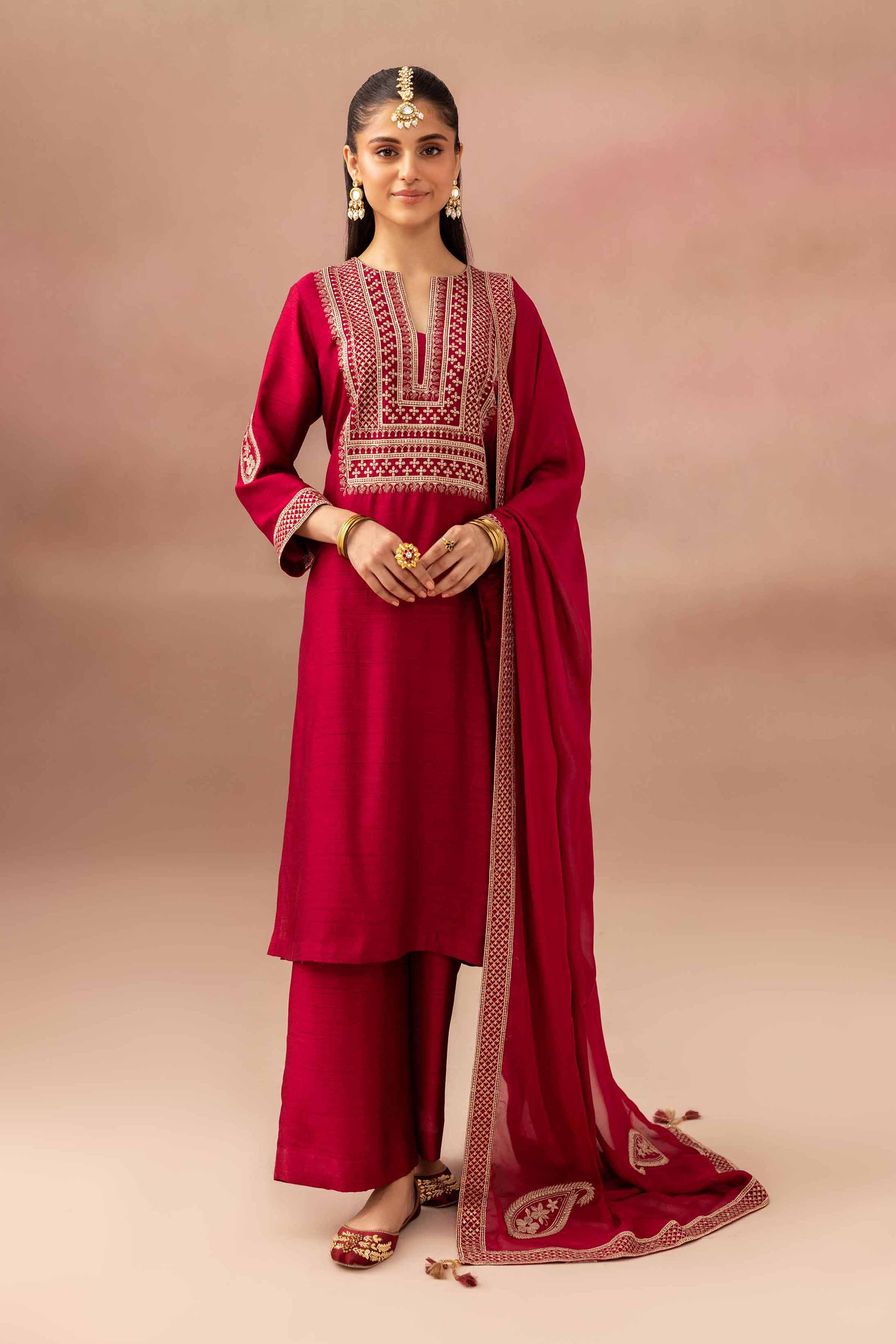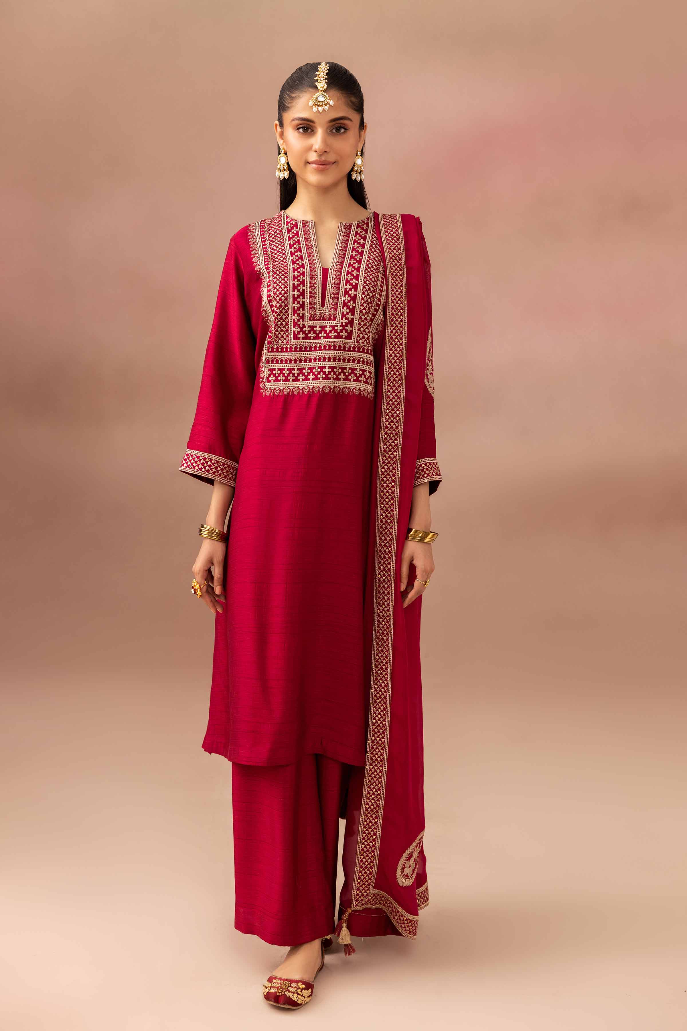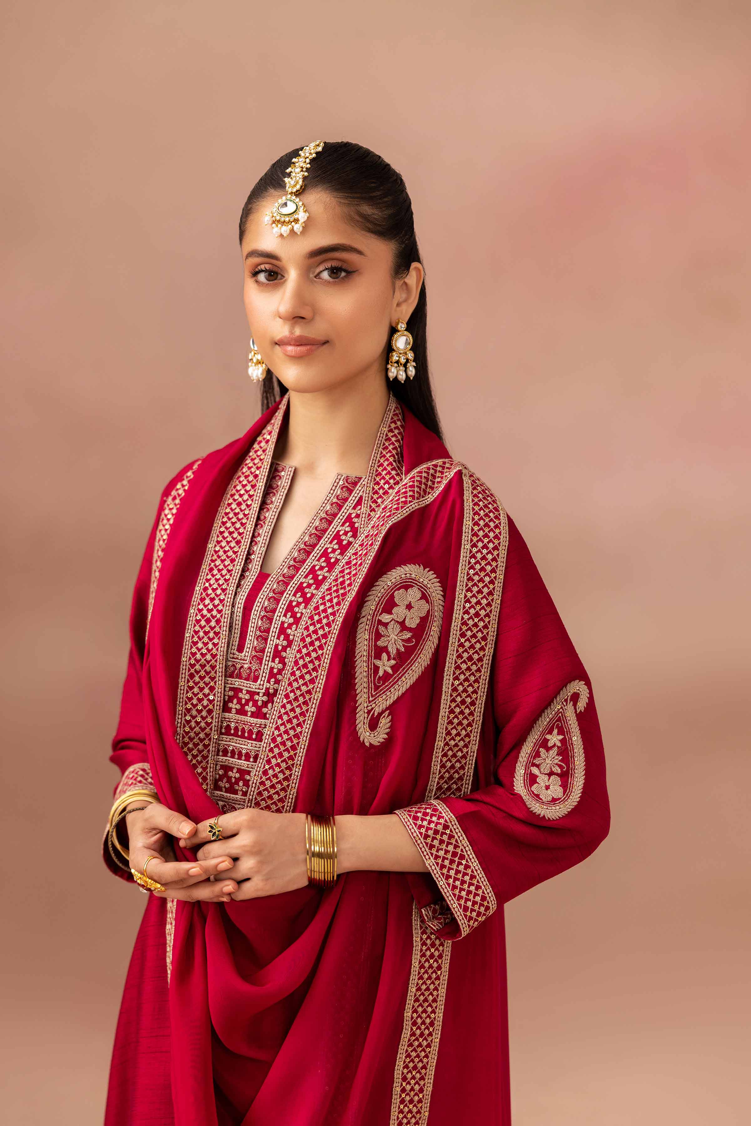 Effortlessly capture hearts with our embroidered three-piece suit from the latest rawayat collection.