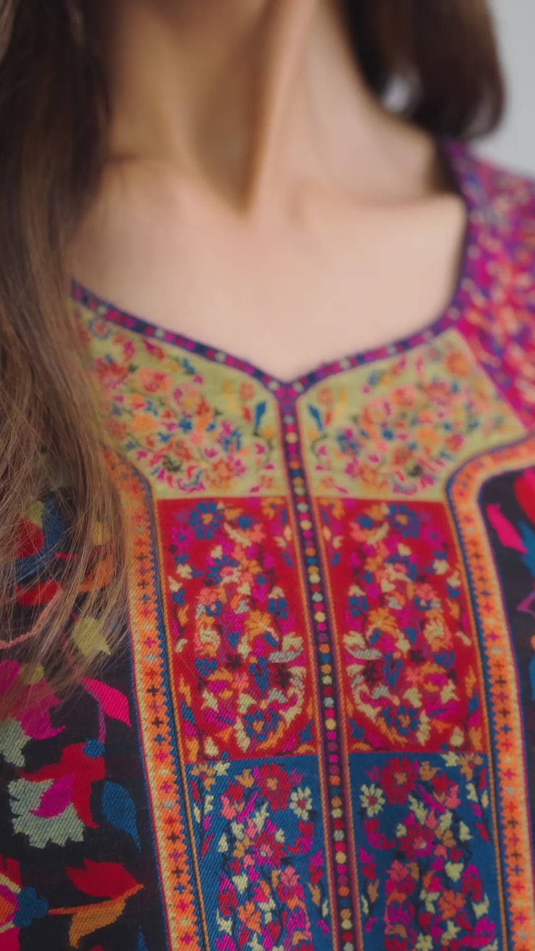 Long Kashmiri Shirt Having Sweetheart Neckline.