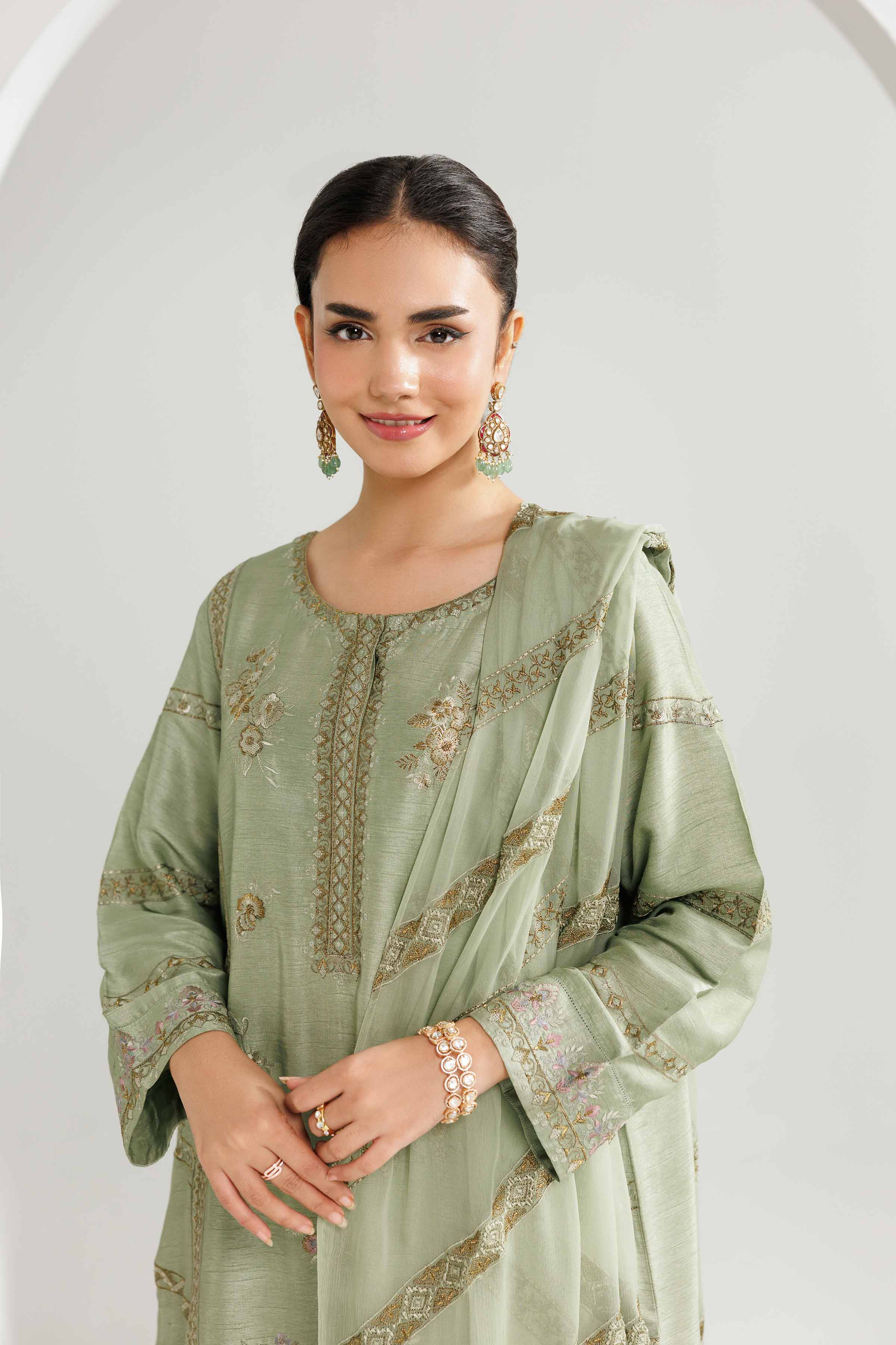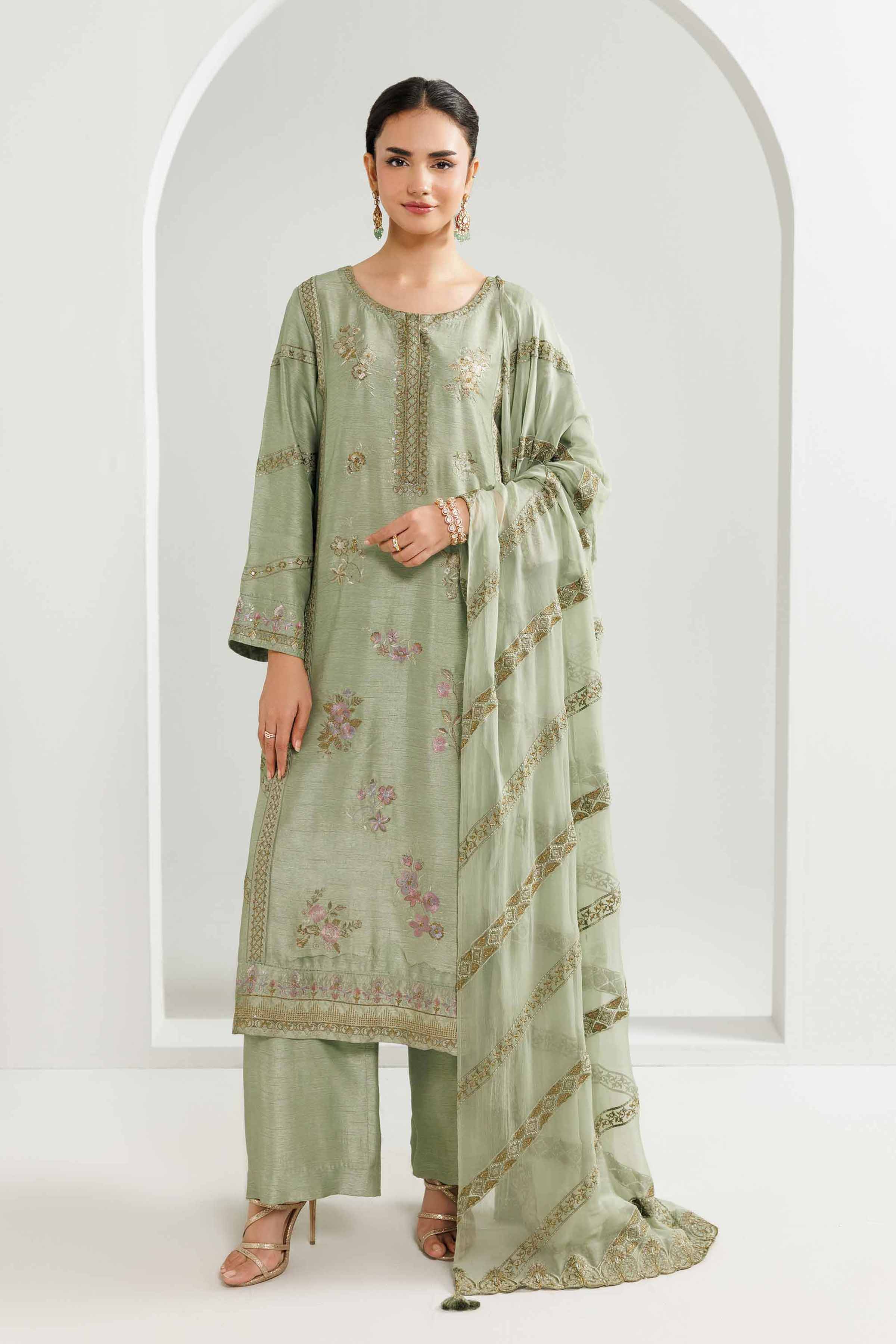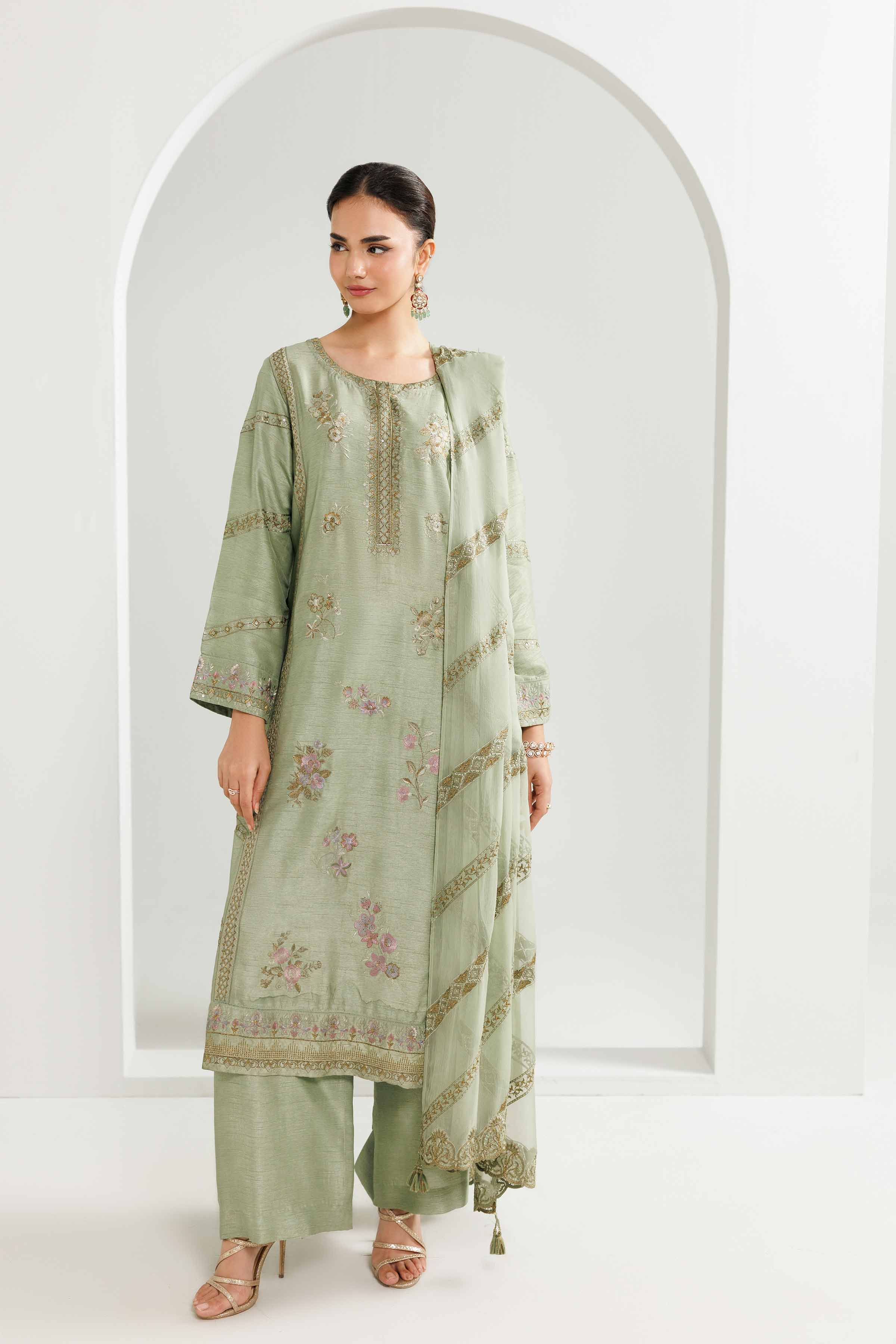 Add refined elegance to your wardrobe with this embroidered three-piece suit from the latest Rawayat Winter Collection, featuring intricate detailing.