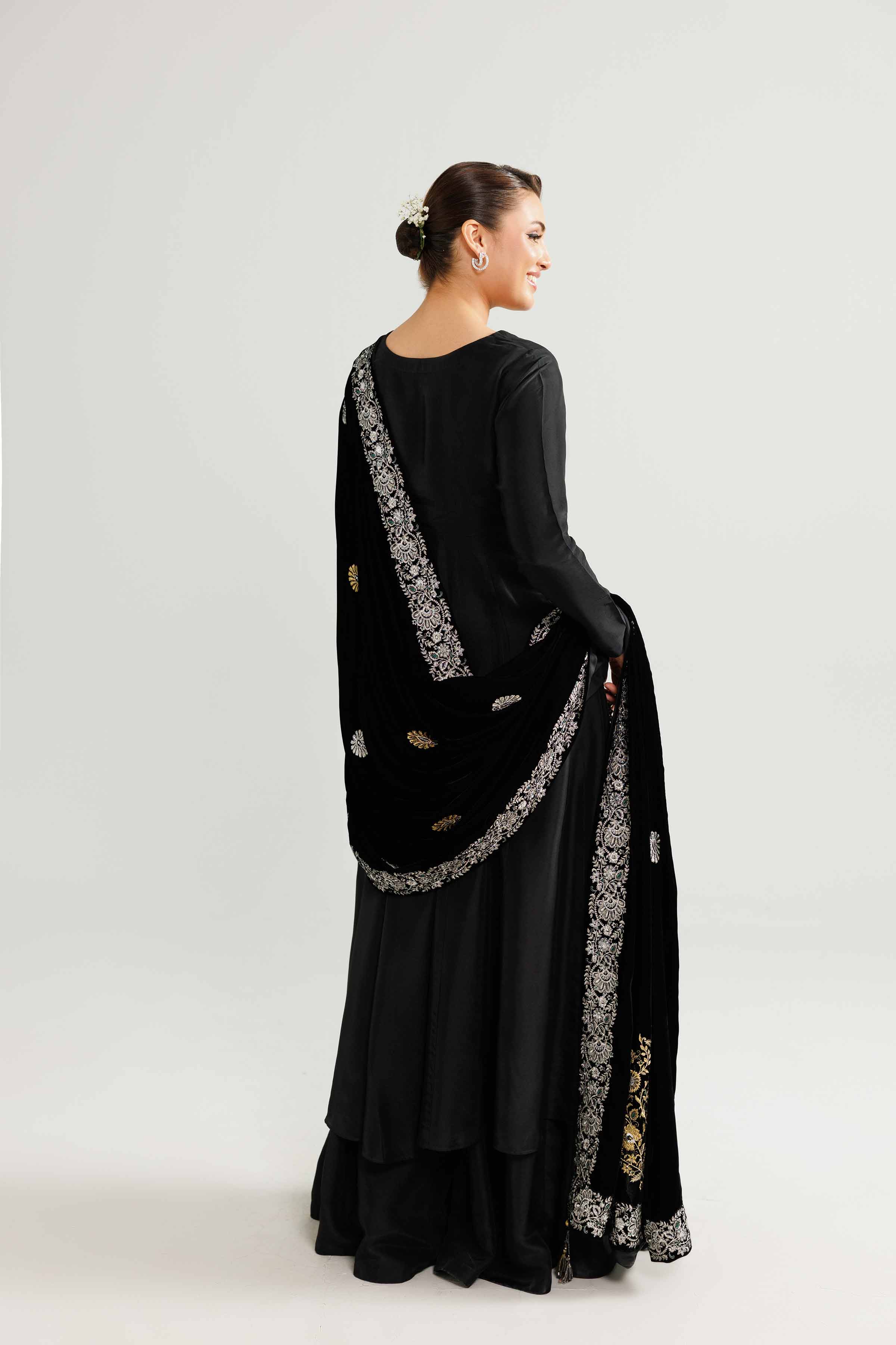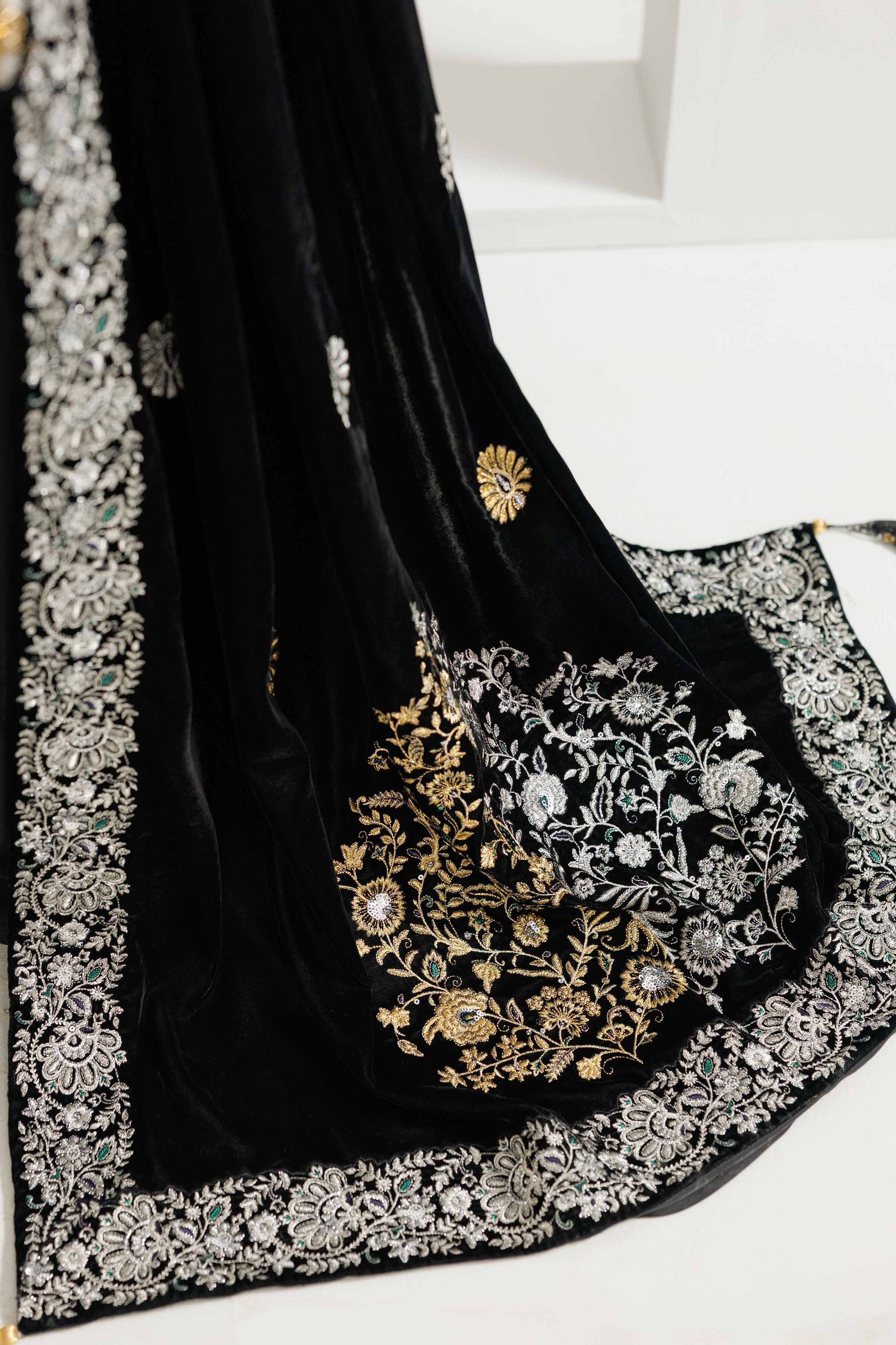 Stand alone velvet embroidered shawl embellished with tilla and badla work, enhanced with fancy tassels.